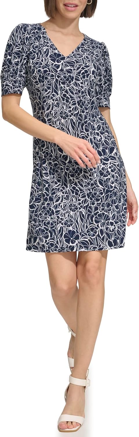 This Tommy Hilfiger Women's Dresses Dress is a puff sleeve v neck short sleeve shift dress polka dot