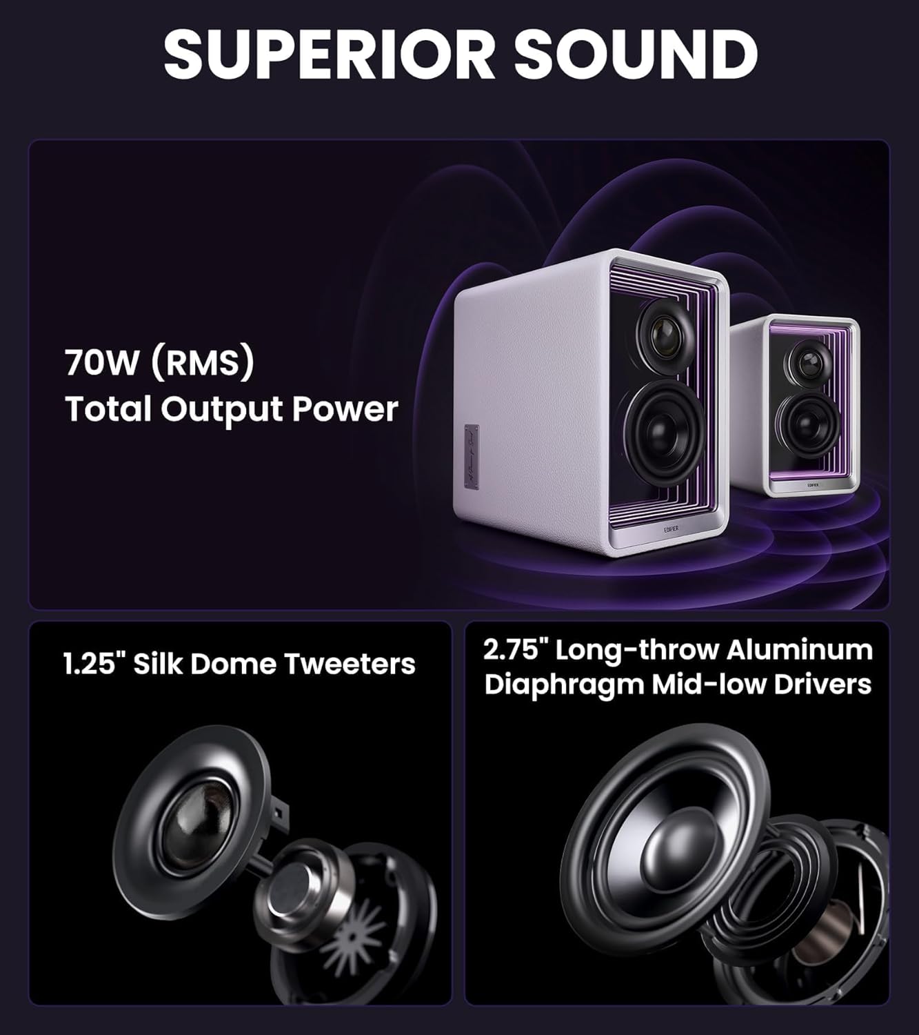 [Superior Sound] 70W (RMS) total output power with Class-D Tl amplifier chips, featuring 1.25" (32mm) silk dome tweeters with neodymium magnets and 2.75" (70mm) long-throw aluminum diaphragm mid-low drivers. The well-designed acoustic architecture for a premium sound experience.