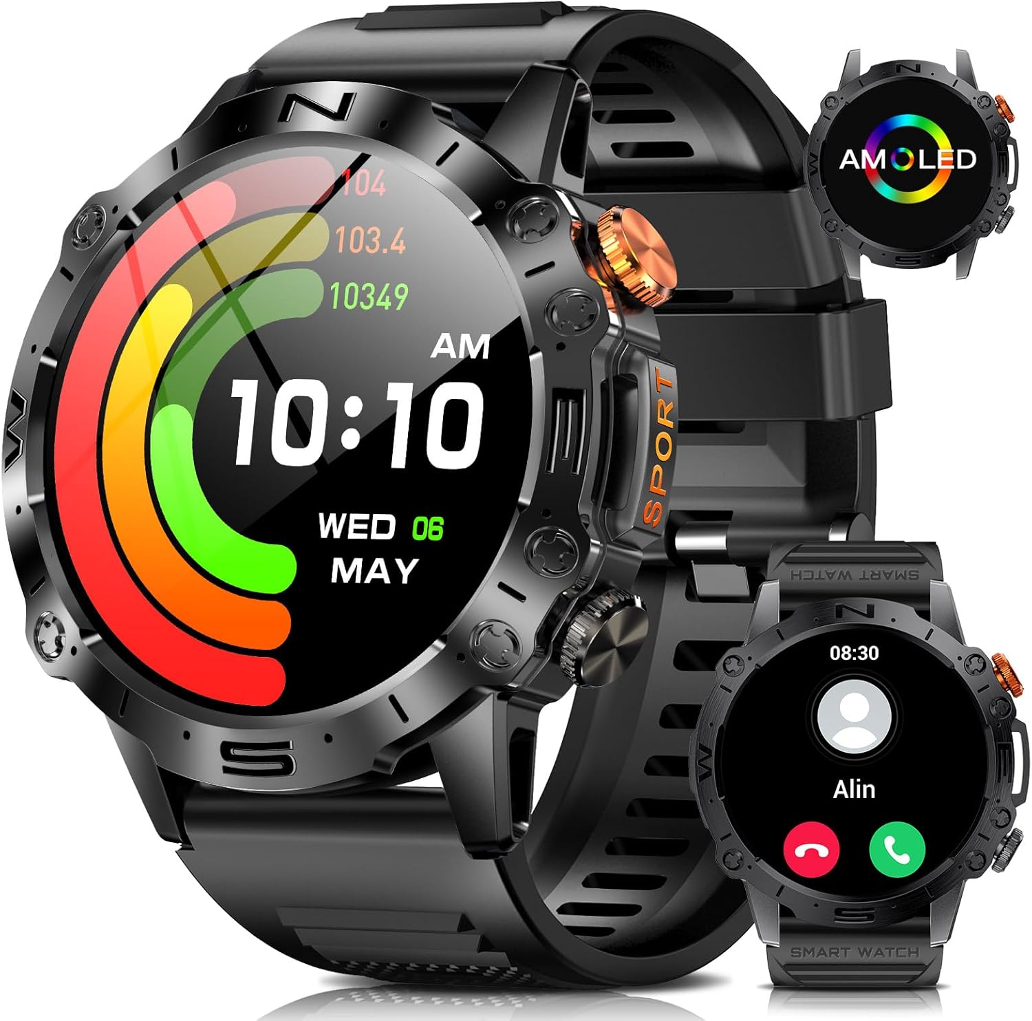 Smart Watch for Men(2 Straps),1.43" AMOLED Screen Fitness Tracker with 5ATM Waterproof,126+ Sports Modes,24H Heart Rate/SPO2/Sleep Monitor,Rugged Tactical Military Smartwatch for iOS Android