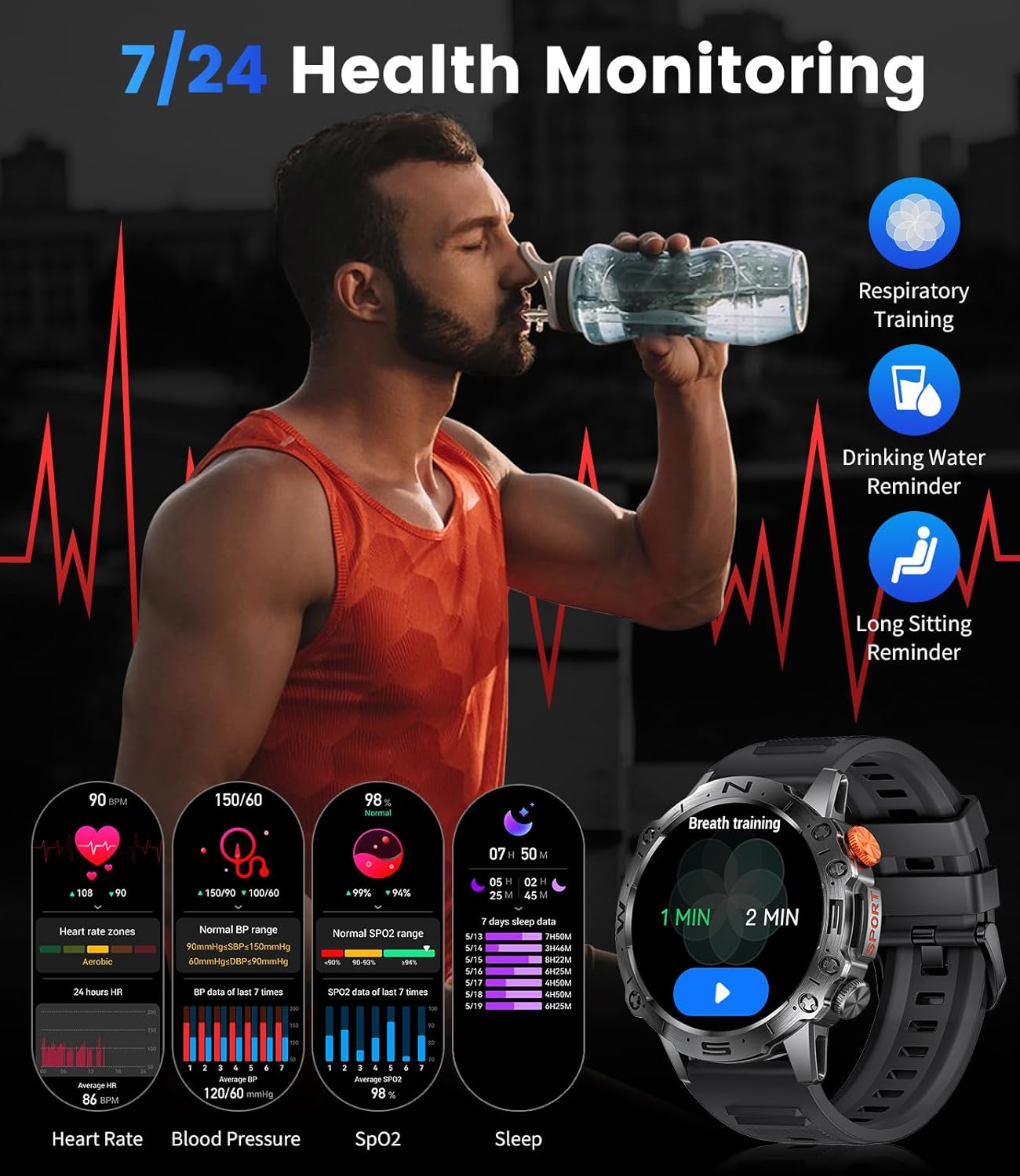 🚴 126+ SPORTS MODES&24H HEALTH MONITOR-This mens smart watch with 126+ sports modes(Running, cycling, ball sports.etc.)and health monitoring can track diverse activities, record distance, speed, and calories burned. Health monitoring includes real-time heart rate/blood pressure/SpO2, sleep analysis,which provide insights into daily habits, aiding in the improvement of overall health. But the fitness watches for men are not a substitute for medical devices and cannot be used for medical purposes.