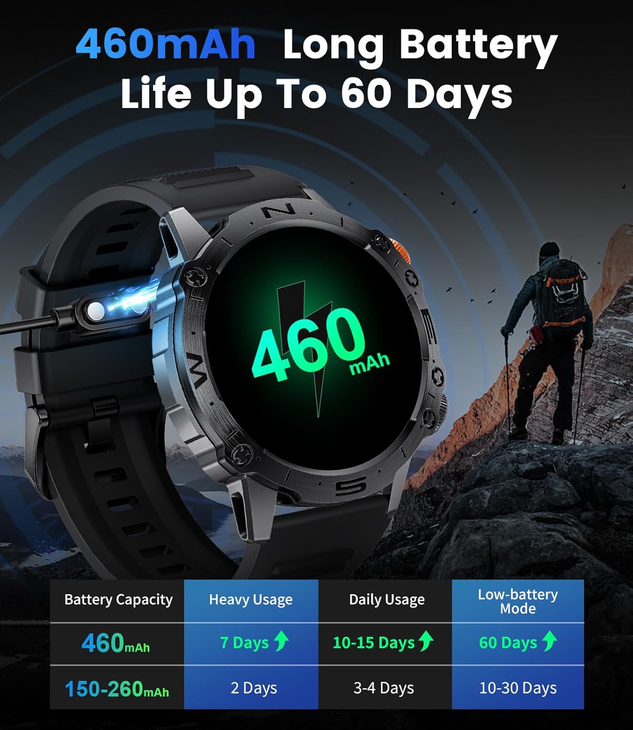 🎖 12 MILITARY STANDARDS AND 5ATM WATERPROOF-This military smart watches for men features a 3rd generation Corning Gorilla Glass screen with a remarkable 9H hardness, effectively shielding it from screen breakage. Its robust zinc alloy case, corrosion-resistant 304 stainless steel band, and fully enclosed 5ATM waterproof design guarantee reliability in the face of extreme environments. With energy-efficient AMOLED technology and a sizable 460mAh battery, it offers an impressive 7-15 days of usage and an extended battery life of up to 60 days.