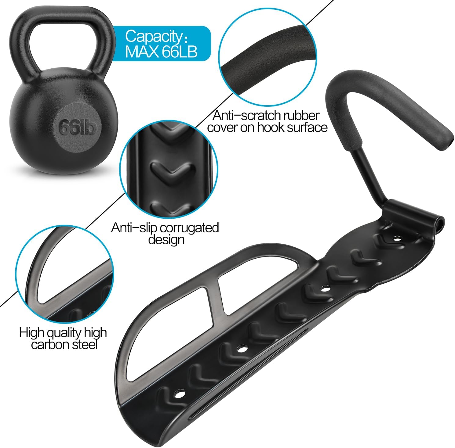 【Anti-scratch Rubber Hook】- The metal hook is covered with rubber to protect bike tires from scratches and can only be used on bikes with tires less than 3.3in wide.