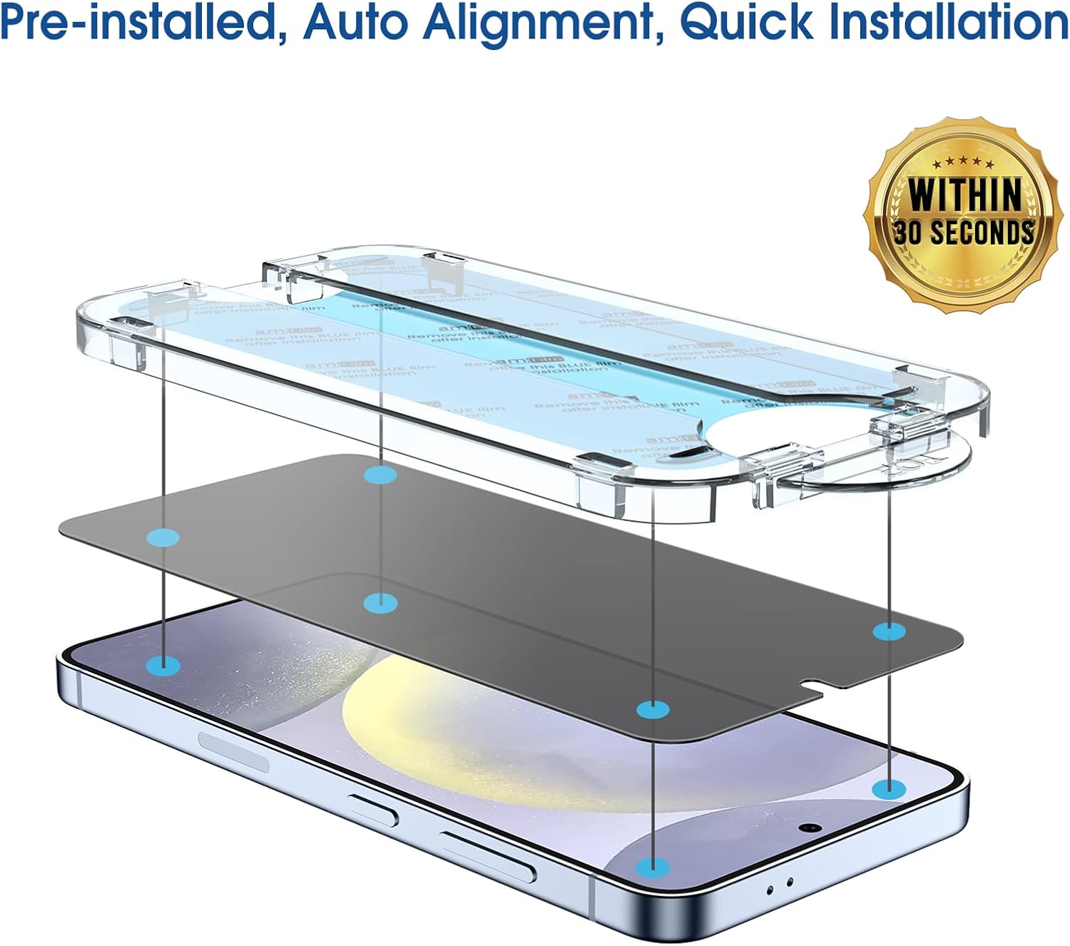 【Patented Auto-Alignment Tech】Perfect installation within 30 seconds! The Galaxy S24+/S24 Plus screen protector is embedded in a plastic frame that fits perfectly over your phone. Set the frame on your phone, swipe down the middle, and done! Watch our Installation Video to see how easy it is to use our Innovative OneTouch Auto-Alignment Screen Protector.