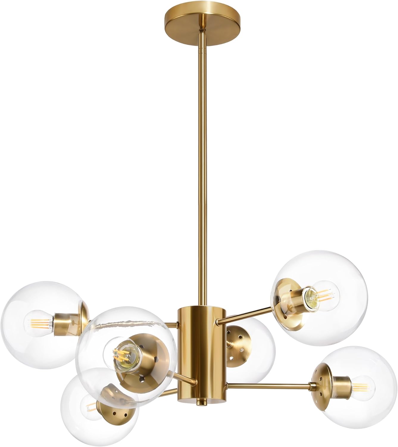 6-Light Globe Sputnik Chandelier Modern Gold Sputnik Chandelier Mid Century Pendant Light Brushed Brass Finished with Clear Globe Glass Lampshade Chandeliers for Dining Room Kitchen