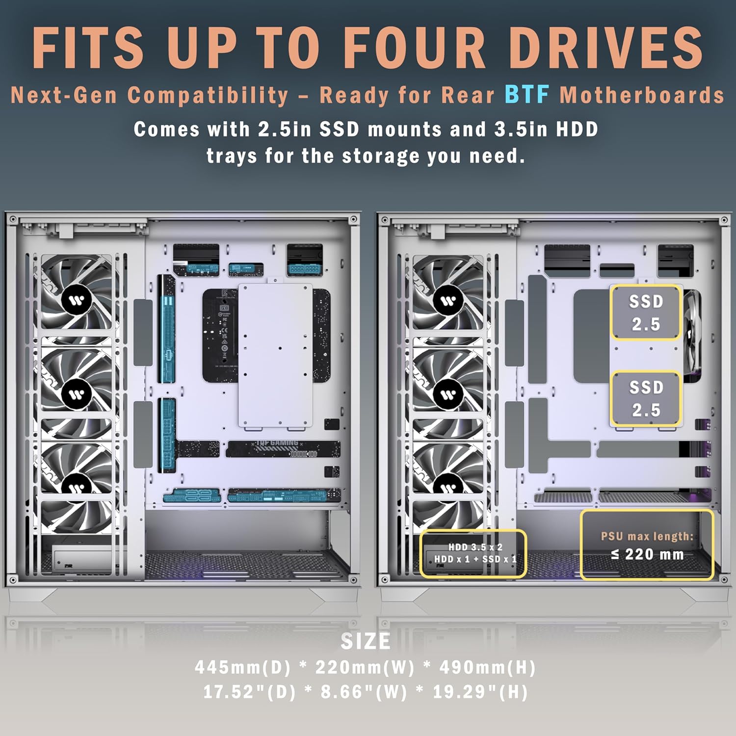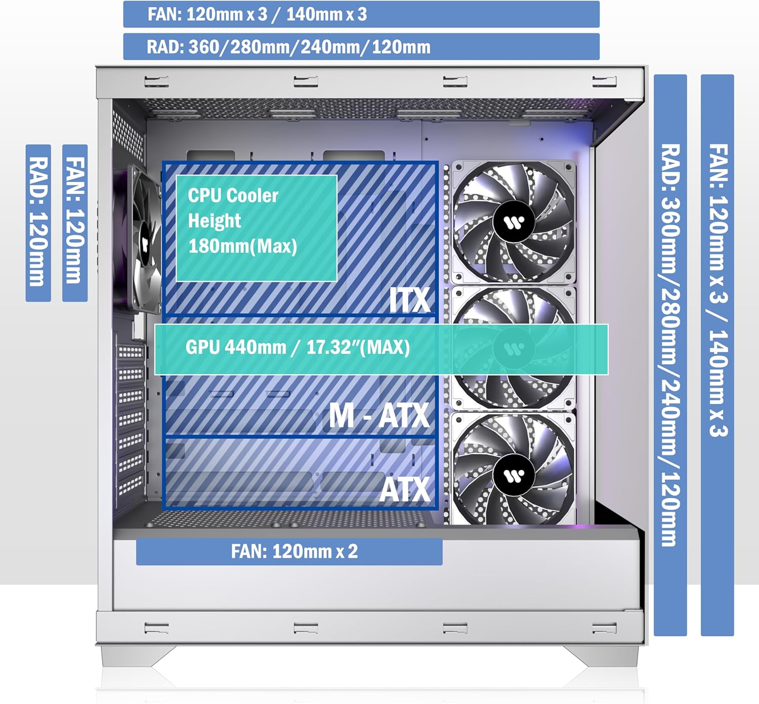 [Remarkable Expansion]-- (1)The Mid Tower Gaming Computer Case supports ATX / Micro-ATX / Mini-ITX motherboards.(2) Support 360mm Radiator (3) CPU cooler height maximum 180MM (4) GPU length maximum 440MM (5) Power supply type ATX up to 220MM (6) Equipped with HDD and SSD trays (7) Expansion PCIE-Slots 7 (8)Fits up to 9 x 120mm Case Fans and 2x simultaneous radiators.