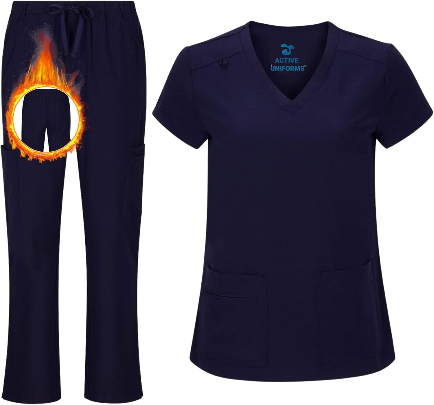 Women's Cool Stretch V-Neck Top and Cargo Pant Scrub Set with Regular and Petite Sizes