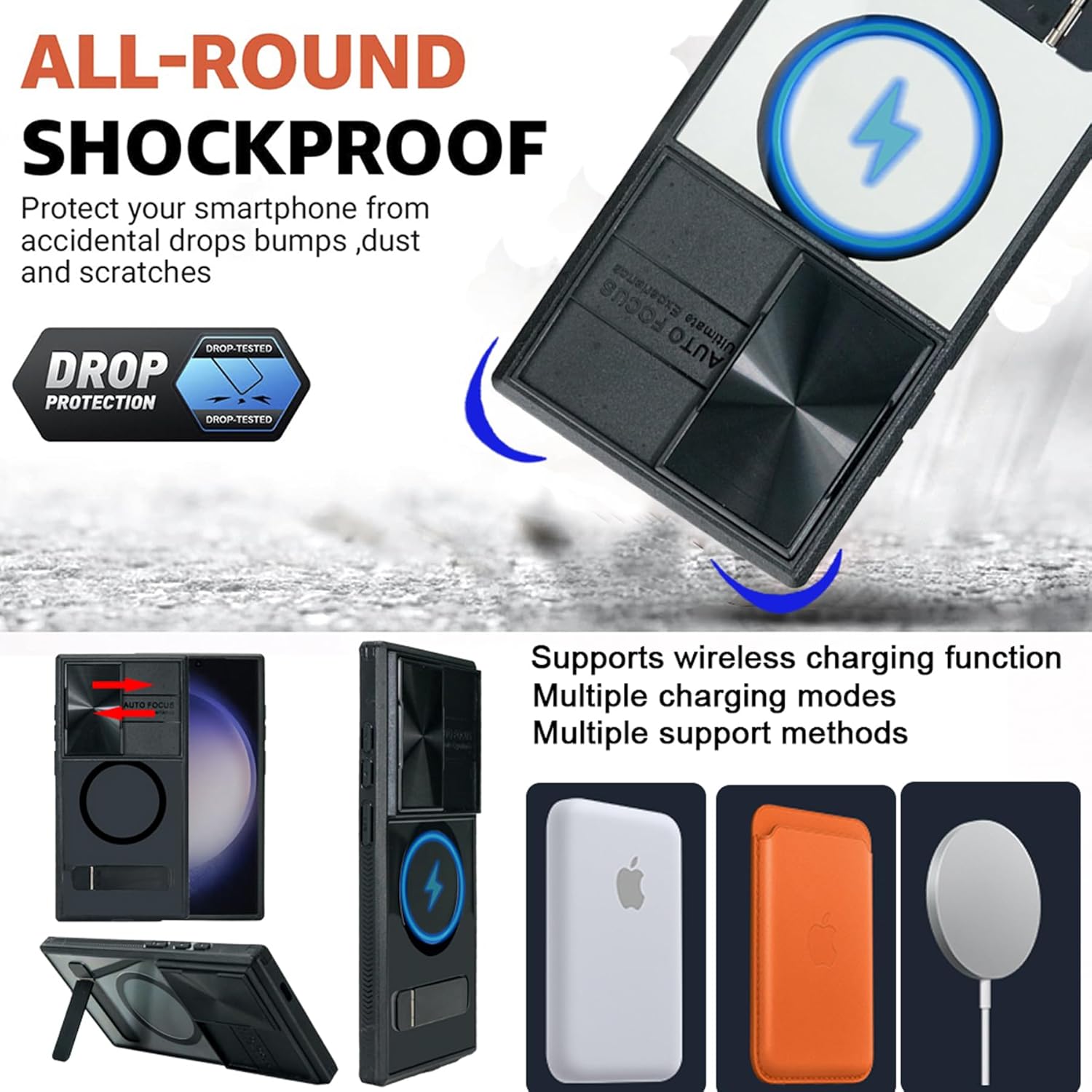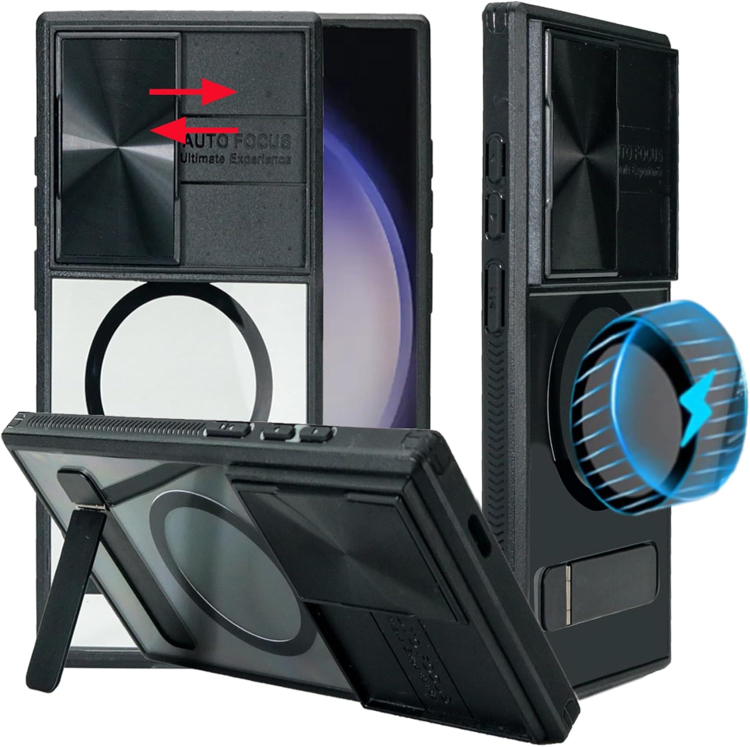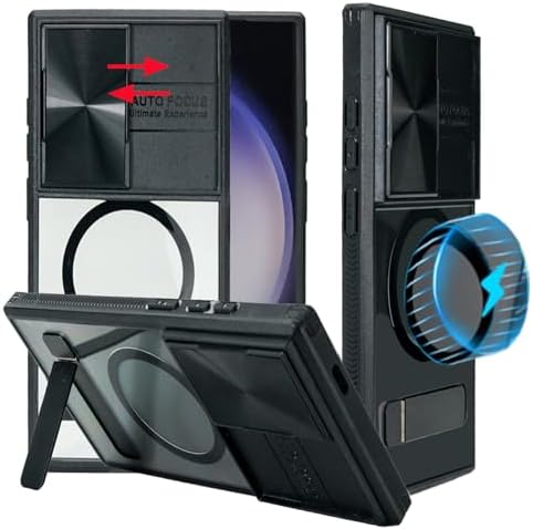 Woluki for Samsung Galaxy S24 Ultra Case Compatible with MagSafe, Built-in Slide Camera Cover, Versatile Metal Kickstand [3 Stand Ways] Military Grade Shockproof Phone Case for Samsung s24 Ultra 6.8" Features: 1. Slide Camera Cover, protects the lens from scratches and privacy protection. 2. Compatible with magsafe, Built-in Metal Circle Comatible with MagSafe ( NOT Compatible with MagSafe Wallet and MagSafe Battery). 3. Built-in Versatile Metal kickstand, [3 Stand Ways] view angles adjustable, can bring you a convenient viewing experience. Vertical and horizontal stand perfect for video calling or watching shows / movie. 4. soft TPU frame and Hard high clear PC back Heavy Duty Protection.. 5. Work with wireless charger, no need to remove case when you going to chager the phone. 6. Precisely cut openings to allow full access to all the functions of your phone. 7. 1mm and 2mm raised edges protect your Samsung galaxy s24 ultra screen and camera.