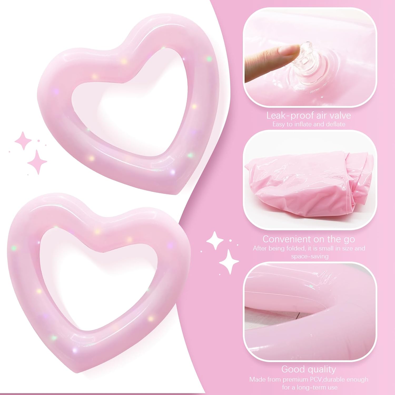 Flotador de piscina en forma de corazón, exquisito y elegante, te hará ver más encantador en la piscina. Con suficientes en stock, el corazón inflable puede usarse como decoración y accesorio para fiestas en la piscina, así como para tomar fotos y compartir con otros. El corazón de la piscina será el accesorio ideal para tomar muchas fotos románticas significativas, perfecto para fiestas de bodas en la piscina, fiestas de compromiso, fiestas del Día de San Valentín, bodas en la playa y más, añadiendo más diversión a tus actividades en la piscina y en la playa. El flotador de anillo de compromiso en forma de corazón se puede fácilmente desinflar e inflar, haciendo que el corazón en forma de playa sea conveniente para llevar en viajes, natación, etc.; después de desinflarlo, el flotador de corazón inflable se puede doblar y poner en tu bolsa o equipaje