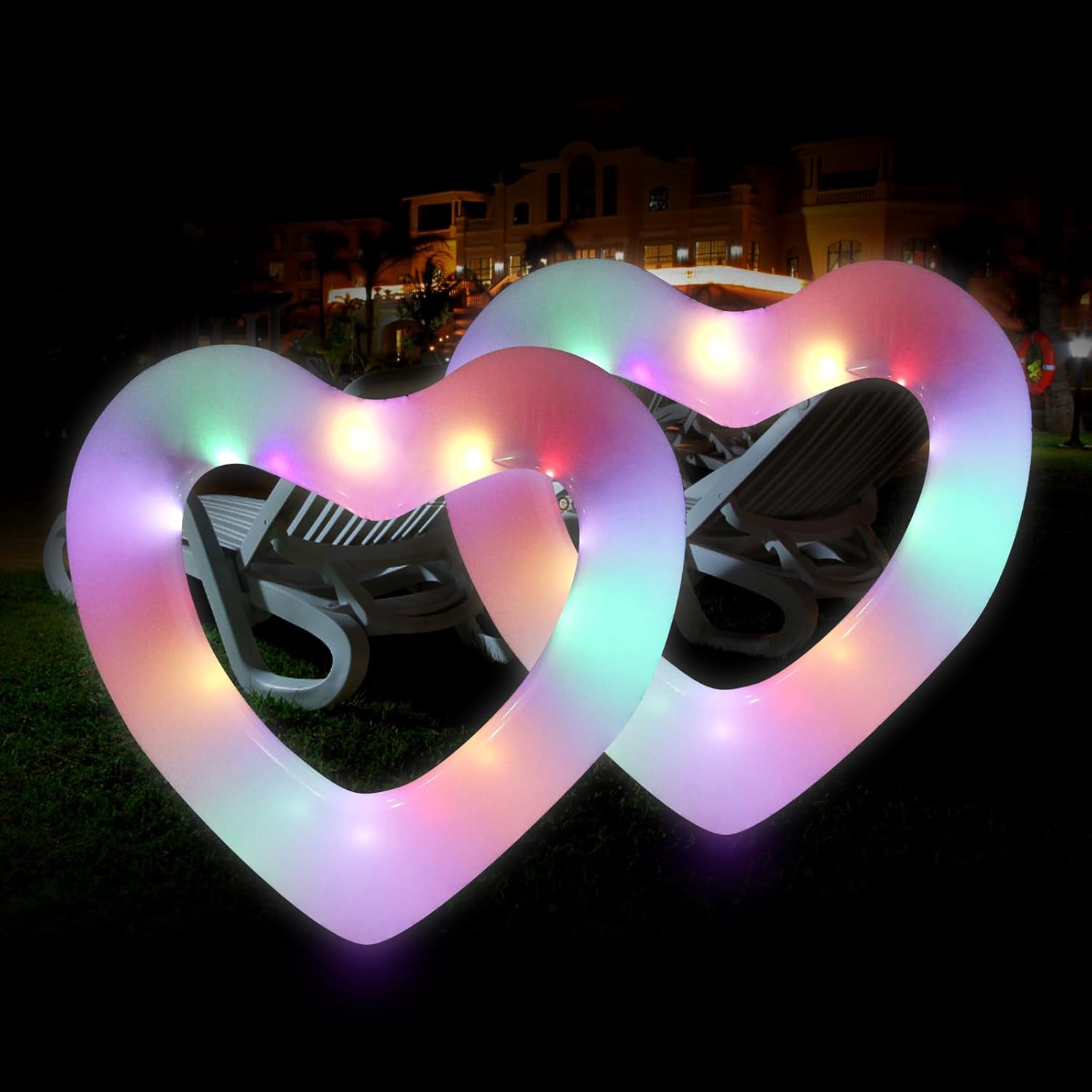 Aspecto especial: Este producto está diseñado en forma de corazón, perfecto para juguetes divertidos de piscina para el Día de San Valentín, fiestas para solteros, fiestas de verano y fiestas del Día de la Independencia, etc. Seguro y duradero: El flotador de piscina en forma de corazón está bien hecho de PVC premium, con luces LED incorporadas que pueden cambiar de 16 colores, y el control remoto incluido puede ajustar el color y el brillo, día y noche es la decoración perfecta para el jardín. Portátil e inflable: El tamaño del anillo de natación inflable es de 47.3 x 39.4 pulgadas, y cuenta con un diseño de válvula mejorado para minimizar el riesgo de fuga de aire. Además, es fácil de inflar y desinflar, cuando está desinflado, es relativamente ligero y ahorra mucho espacio en tu mochila. Ampliamente utilizado: El anillo de natación inflable puede usarse en piscinas, playas, parques acuáticos y otros lugares. También puede usarse como accesorio para actuaciones, fotografía, regalos de verano y más, trayendo alegría sin fin. Regalos adorables: El mejor regalo de cumpleaños, un regalo de verano, nada supera a los flotadores de piscina coloridos para hacer que nadar sea más divertido. Son perfectos para fiestas en la piscina y son un gran regalo para los jóvenes