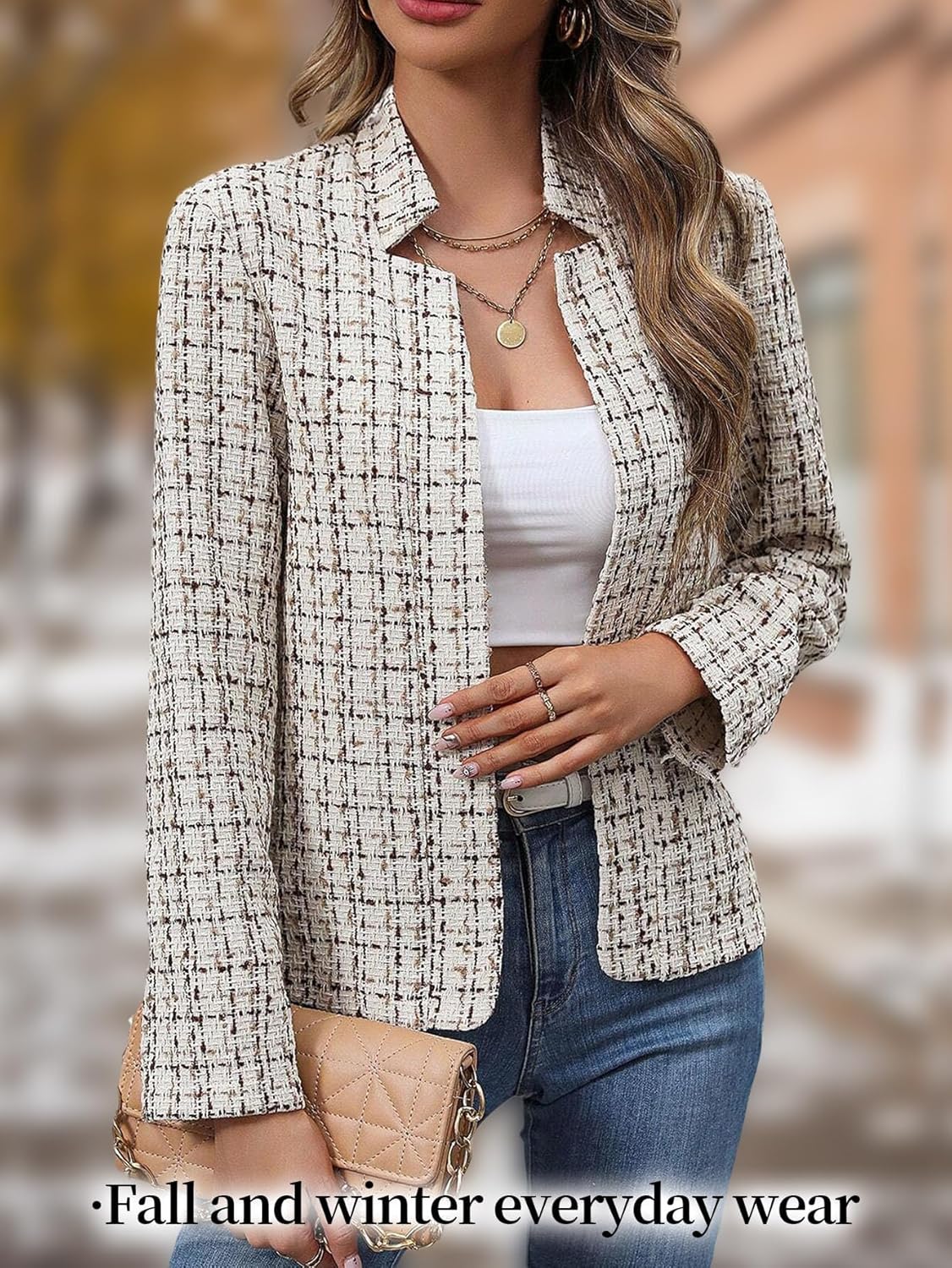 Mina Self 2025 Fall Women's Tweed Plaid Blazer Jacket - Open Front Stand Collar Fully Lined Casual Fashion Elegant Work Coat