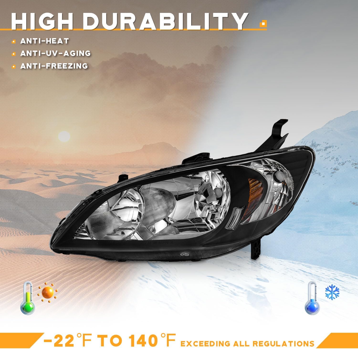 OEM#: 33151-S5A-A51, 33101-S5A-A51: Get a 100% match for your vehicle: This replacement is ideal for𝟐𝟎𝟎𝟒-𝟐𝟎𝟎𝟓 𝐇onda 𝐂ivic 𝟐/𝟒𝐃oor. Kindly note, bulbs are not included; please use stock bulbs for installation.Classic matte black housing: This option is glare-resistant, with an anti-dirt, modern look