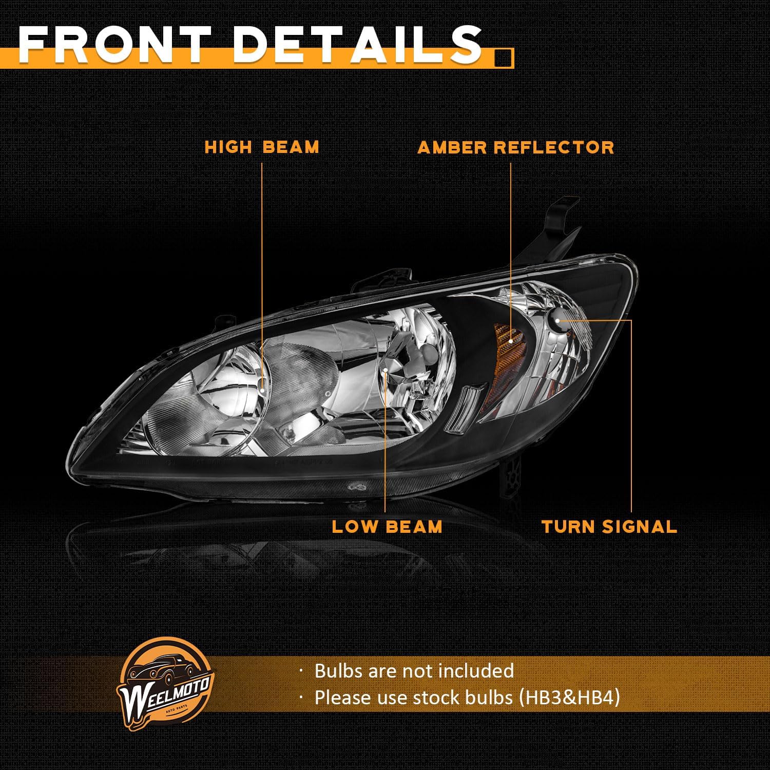 WEELMOTO for 2004-2005 Honda Civic 2/4Door Headlights Assembly Replacement Pair Headlamp Replacement Black Housing Amber Reflector Left+Right Side
