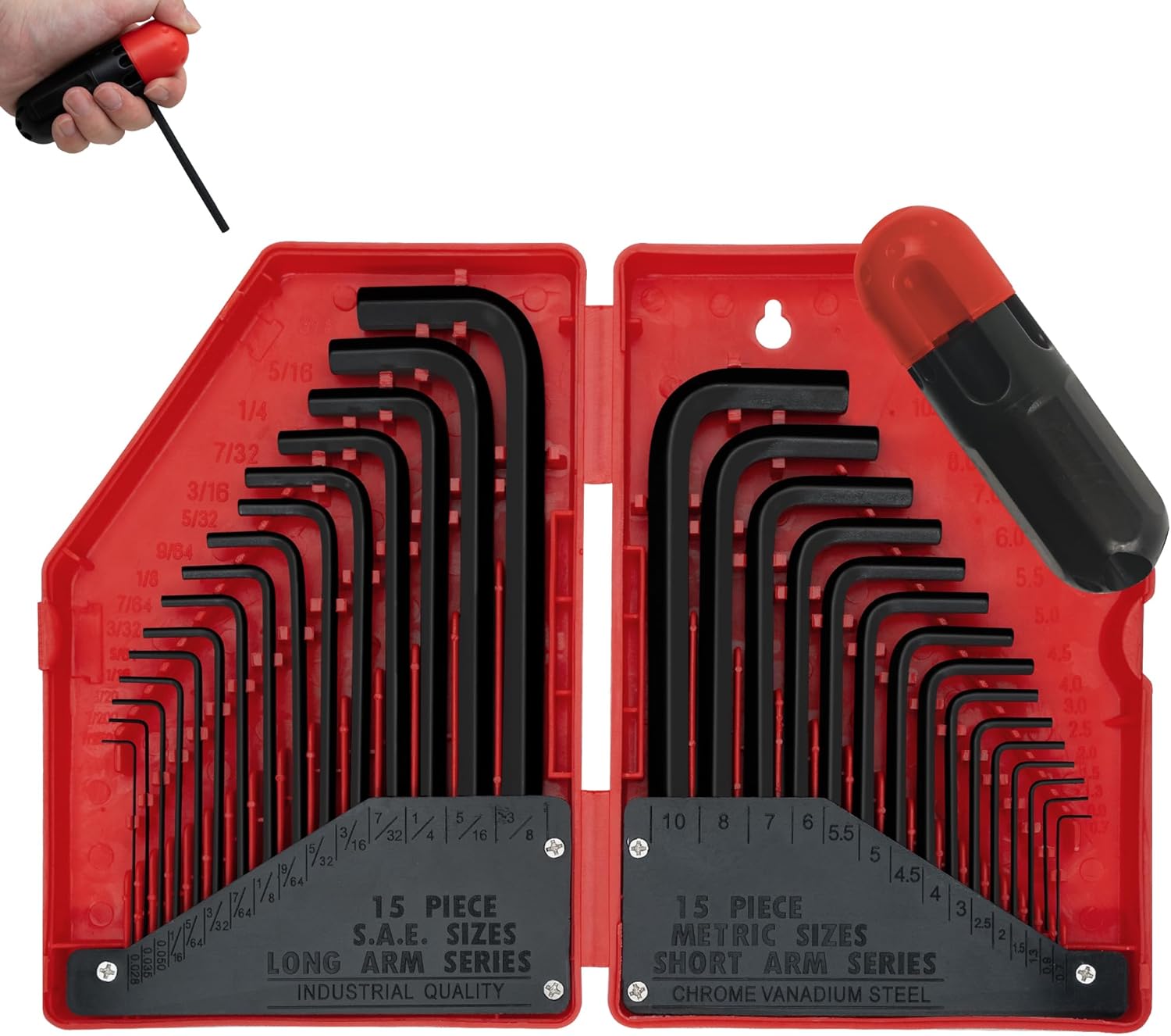 Multiple sizes-Includes 30 different sizes from large to small and even mini: (15) Standard SAE 0.028, 0.035, 0.05, 1/16, 5/64, 3/32, 7/64, 1/8, 9/64, 5/32, 3/16, 7/32, 1/4, 5/16, 3/8” and (15) Metric 0.7, 0.9, 1.3, 1.5, 2, 2.5, 3, 4, 4.5, 5, 5.5, 6, 7, 8, 10mm