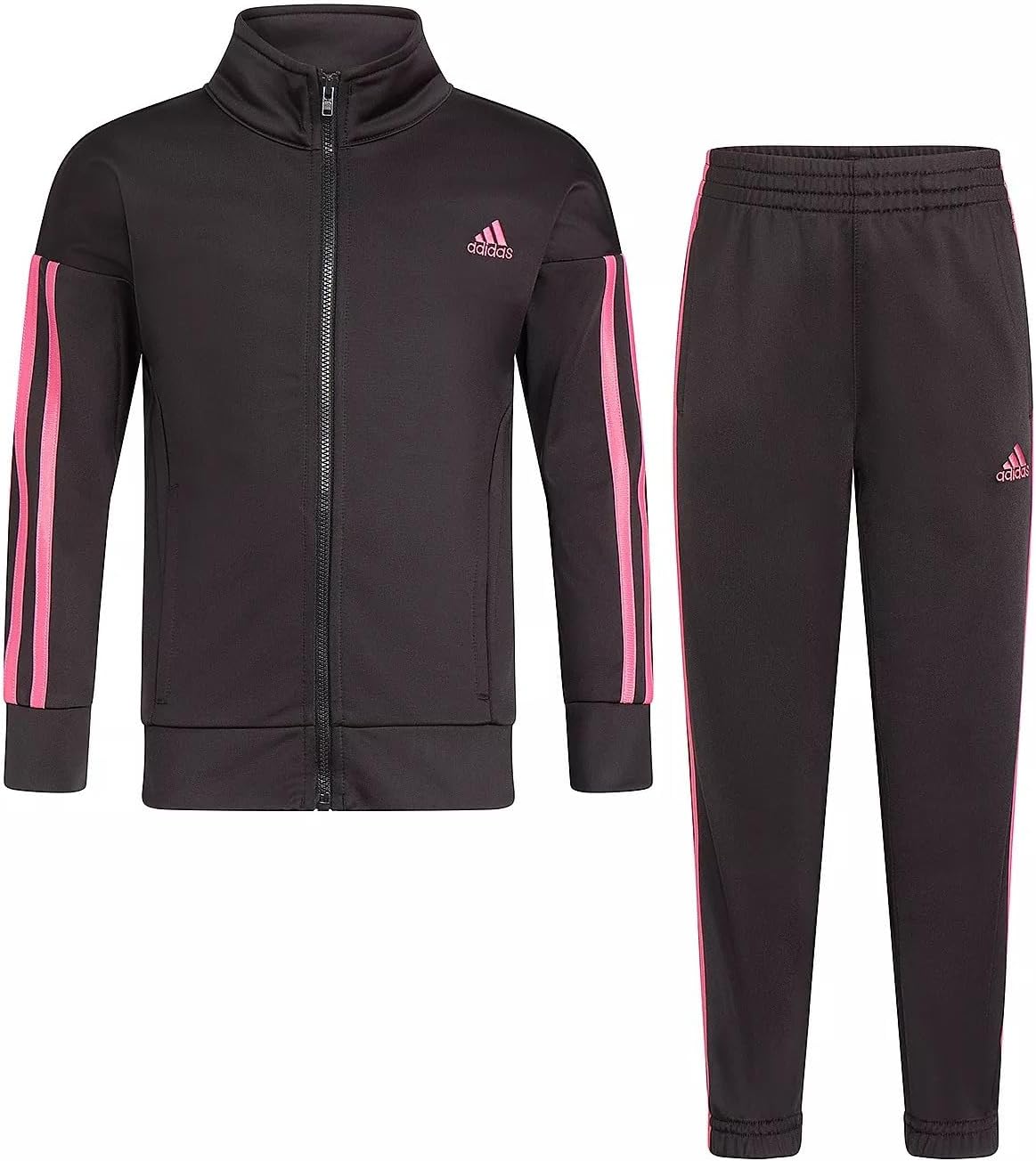 This girls' track set puts your budding athlete in 3-Stripes style. Made of smooth tricot material, it's got a zip-front track jacket and pants that match. An adidas Badge of Sport stands out on the back of the jacket. The pants feature an elastic waist and cuffs for comfort and a secure fit.
