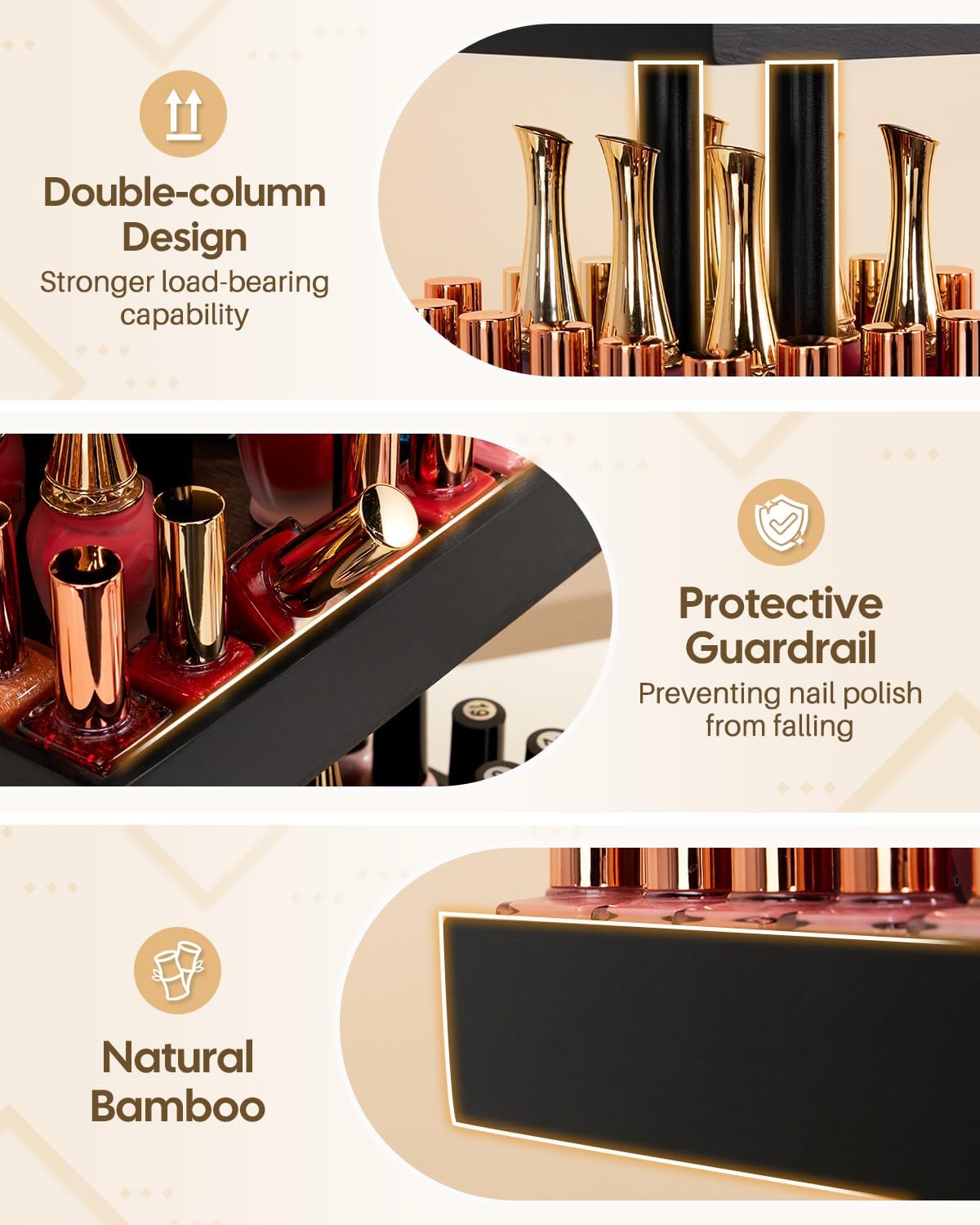 Bamboo Material: Our nail polish stand organizer is made of bamboo, which has excellent strength.