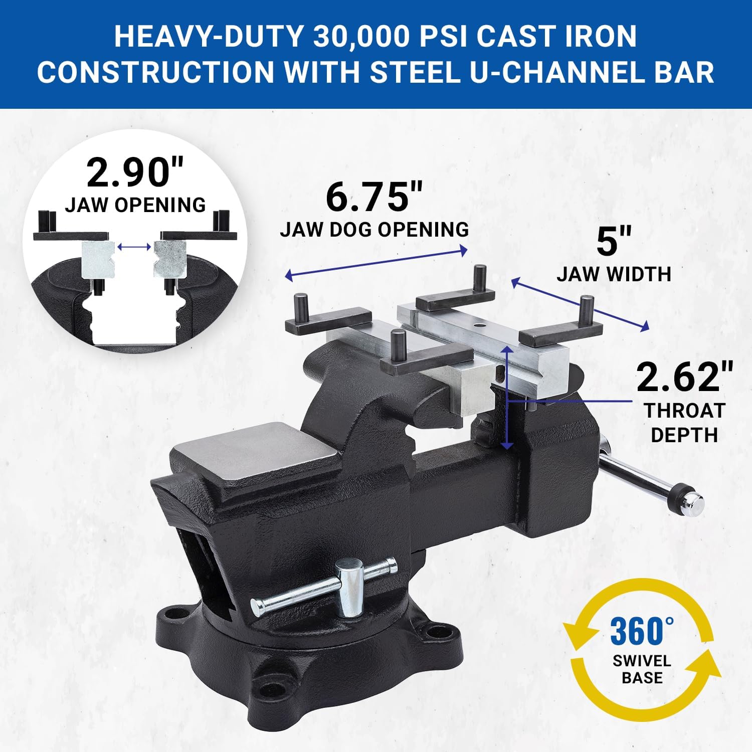🗜️ TECHNICAL SPECIFICATIONS: - Crafted from heavy-duty 30,000 PSI cast iron construction with steel U-channel bar. - Jaw Width 5" | 2.90" max jaw opening, - 360° Swivel Base with (2) Lockdowns - Pipe Diameter Capacity: 0.25 to 2" - Throat Depth: 2.62" - Vise Weight: 20 lbs.