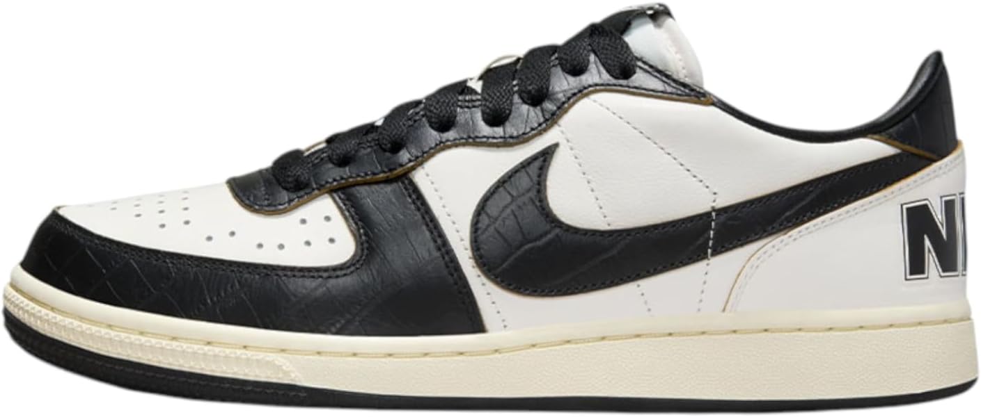 Nike Terminator Low silhouette features a Leather upper with Croc forefoot overlays, a Padded collar, Perforated toebox, Nike logo on the tongue, Croc leather Swoosh on the sides, Woven laces, Nike branding on the heel, and a Rubber cupsole with Herringbone traction outsole. Style: nkfq8127-030, Color: Black / White, Material: Leather.
