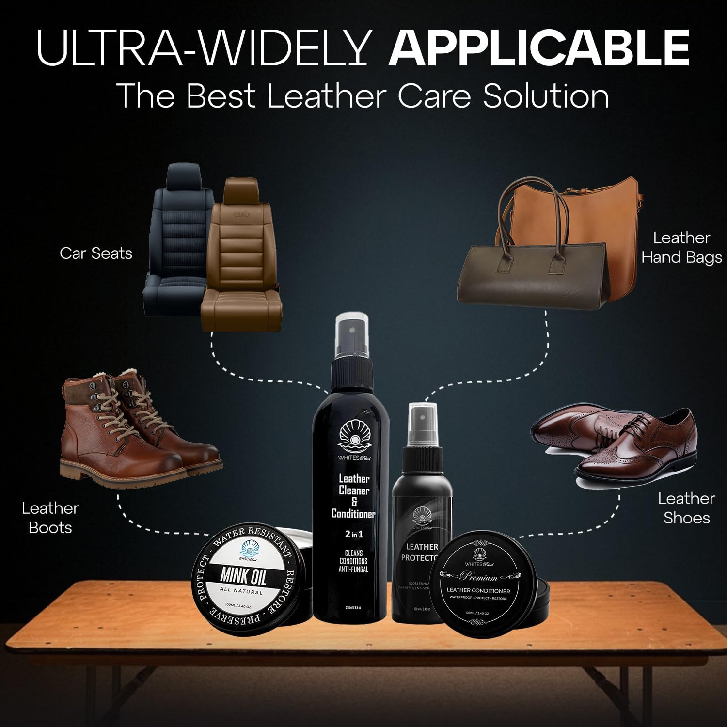 ✅LEATHER CLEANER AND CONDITIONER: Whites Pearl offers a great leather conditioner that not only restores leather products to their classy self, but also makes them soft, and protects them against water and sun damage.