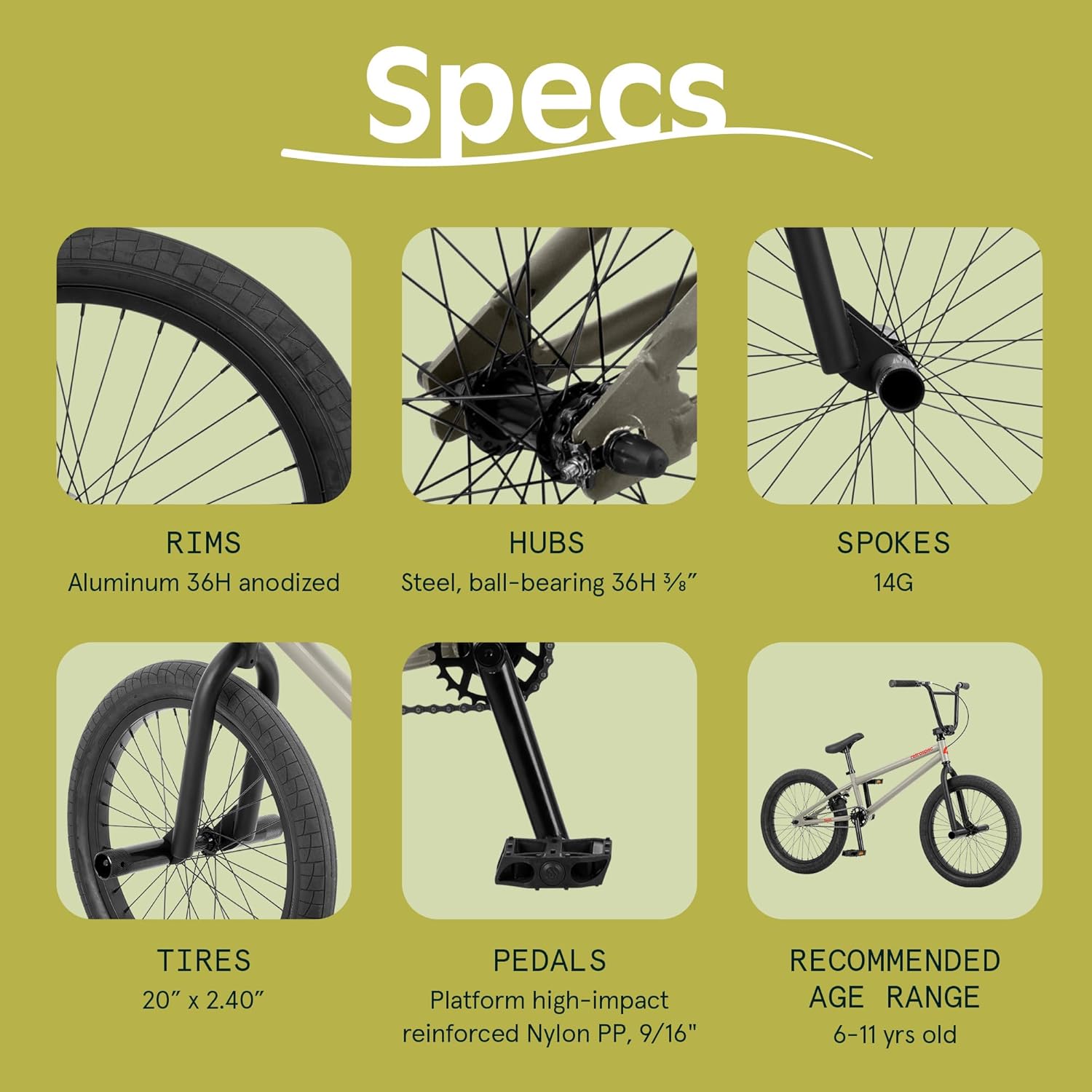 ​ This 20 inch bike combines entry-level accessibility with pro-style features young riders want. The durable steel frame and thick dropouts provide strength for BMX tricks, while the U-brake system offers reliable stopping power. Wide shock-absorbing tires cushion impacts, and the included removable axle pegs let riders customize their bicycle setup. With its 3-piece tubular crank and compact gearing, this youth BMX bike delivers performance for ages 6-11.