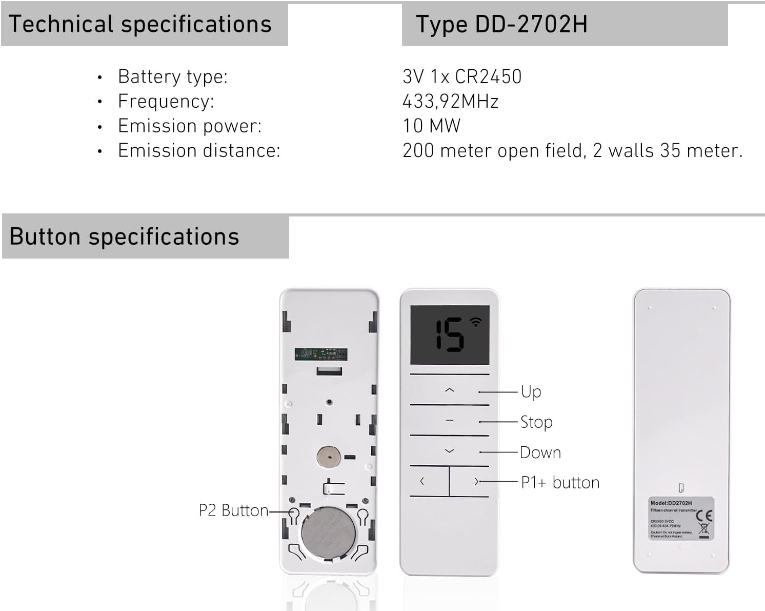DD2702H 15 Channel Bi-Directional Transmitter for Bi-directional Controlled Curtain Motor and Rechargeable Battery Motor