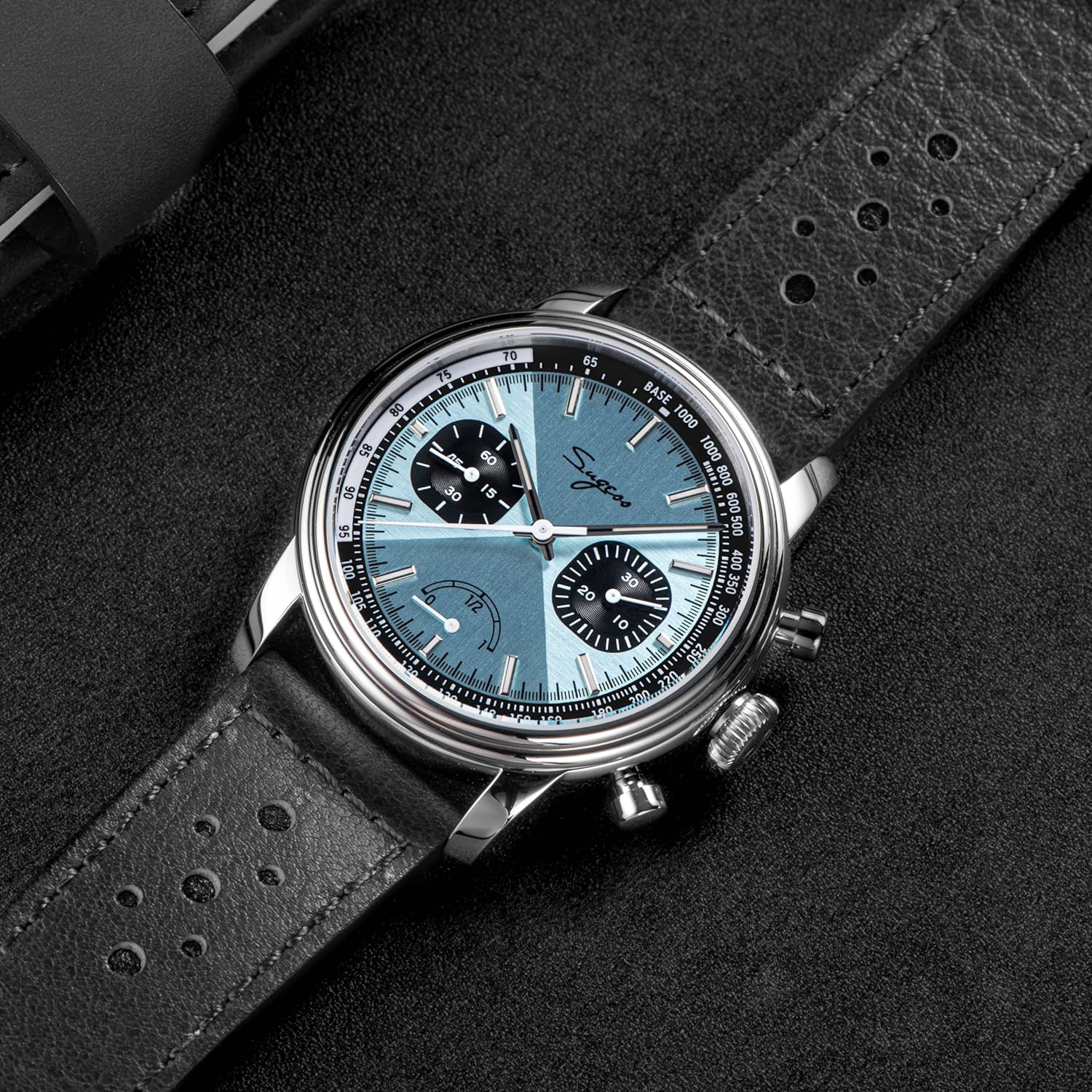 Brand: Sugess Condition: New with tags Series: Chrono Heritage Reference: S438.03.Y Function: 12 Hours and seconds Indicator, 30 Minutes Chronograph Features: Column Wheel Chronograph, Blue steel screws and Exhibition Case Back Cover Diameter: 41mm Thickness: 13mm Glass Material: Sapphire Crystal Case Material: 316L Stainless Steel Band: Leather Movement: Manual winding Caliber: Genuine Seagull ST1906 Jewels: 21 Vibration: 3 Hz (21,600 BPH) Power Reserve: 45 Hours Water Resistant: 5ATM (50 Meters) English Instruction Manual: Yes
