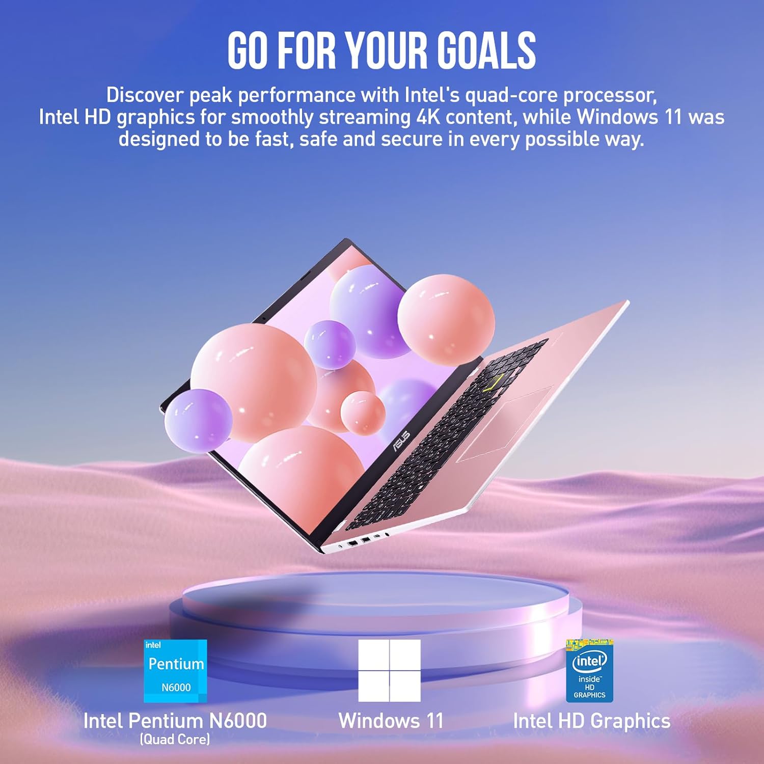 Asus Vivobook Go 15 is designed to help you be productive all day — even when you’re on the move. This compact and lightweight 15 inch laptop is powered by the Intel processor and provides long lasting battery life. With preloaded Windows 11 in S mode, it offers full compatibility with a wide range of software and peripherals. It’s the best laptop pc for people on the go. Processor Intel Pentium N6000 (Up to 3.3GHz Turbo Boost, 4MB Intel Smart cache, 4 cores, 4 threads) - powerful enough for fast multitasking and heavy workloads Display & Graphics 15.6 inch Full HD (1920 x 1080) IPS NanoEdge, Anti-glare, 84% screen-to-body ratio display Intel HD Graphics - stunning visuals and smooth streaming Memory & Storage 4 GB DDR4 RAM - easy multitasking, effortless browsing and streaming 640 GB storage (128GB eMMC+512GB USB Card) - fast bootup, ample storage OS Windows 11 Home S 64-bit (1Y Microsoft Office 365 Included) - the most secure Windows ever built with fast performance designed for school students and teachers. Easily switch to Windows 11 by clicking “Switch out of S mode” under “Activation” in Windows setting Ports, Slots & Features Wi-Fi 5 + Bluetooth - fast and stable connection SuperSpeed 1x USB-C 3.2 +1x USB-A 3.2 (10x faster than 2.0), 1x USB 2.0, HDMI, Audio Jack Built in 720p HD webcam with dual array digital microphones. Enjoy face-to-face video chats in vibrant clarity and exceptional audio with professionally tuned stereo speaker Premium Design Ergonomically designed and sturdy full-size keyboard with numeric keypad for comfortable tying 180° lay-flat hinge holds the display securely at any angle Slim, sleek pink finish design, easily portable even for a 15.6” notebook computer laptop