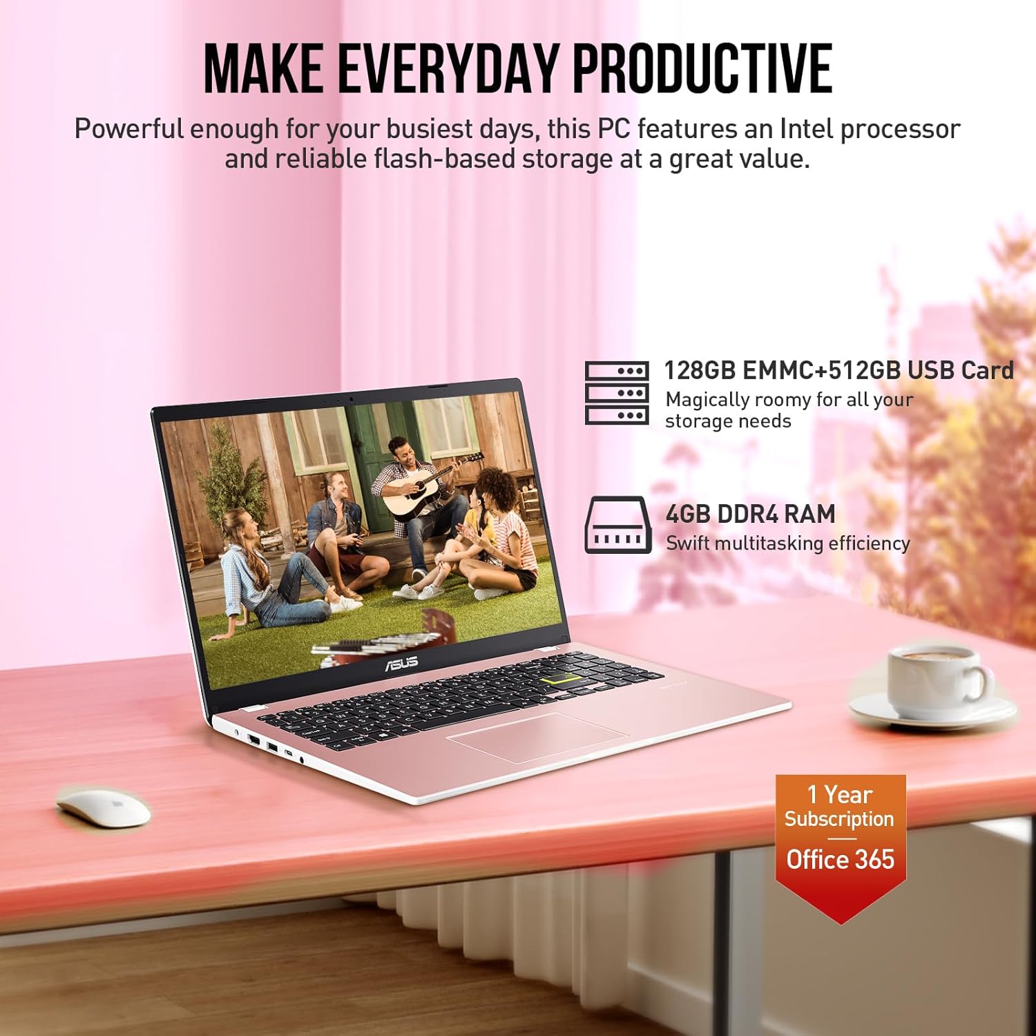 EASY MULTITASKING, AMPLE STORAGE: The pink laptop Asus Vivobook 15.6 simplifies your workday and boost productivity. 4GB high-bandwidth DDR4 RAM breeze through everyday tasks and run multiple applications effortlessly. 128GB high-speed eMMC provides reliable storage and data access while 512GB USB offers more storage. With high performance and instant responsiveness for your busiest days, the quad core lightweight laptop 15 inch is the best laptops for college students and for the price