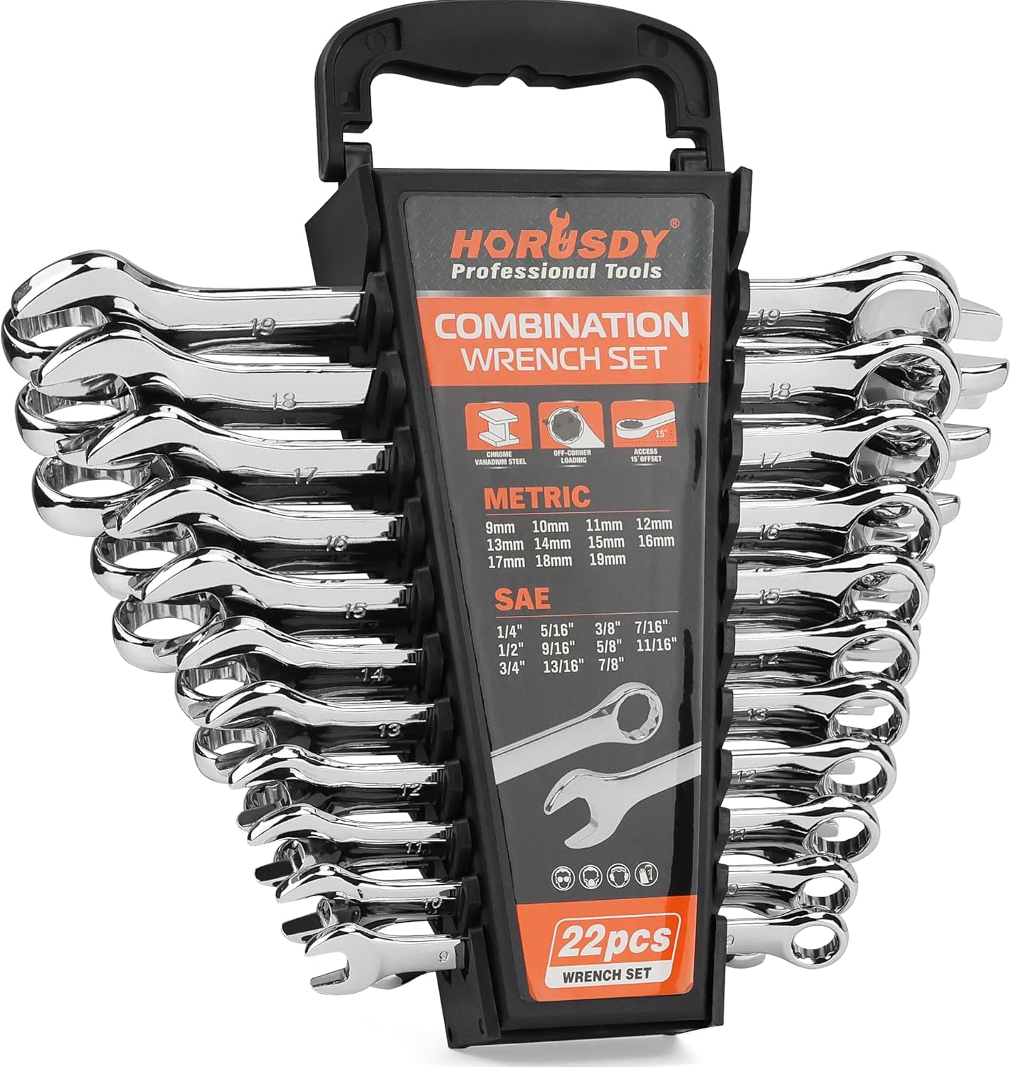 HORUSDY 22-Piece Wrench Set | Metric & SAE Combination Wrench Set with Organizer | 12 Point | Chrome Vanadium Steel