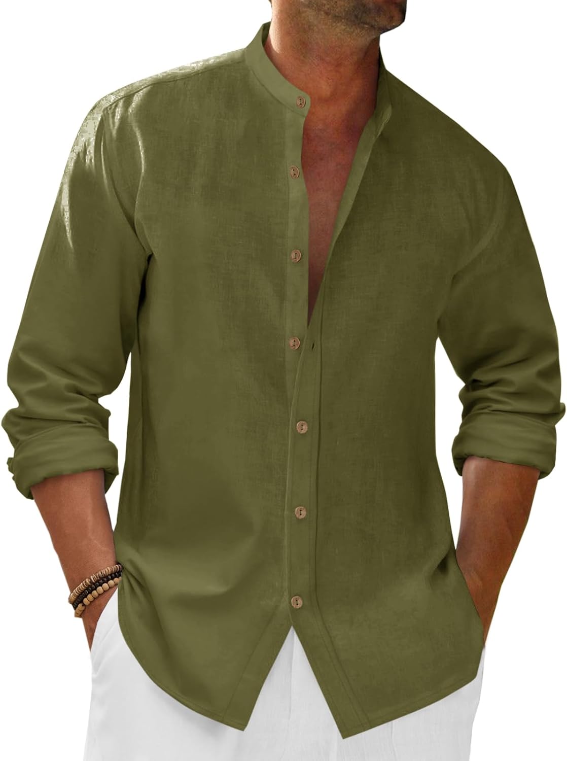 Runcati Mens Casual Linen Shirts 3/4 Sleeve Button Down Banded Collar Summer Beach Shirt