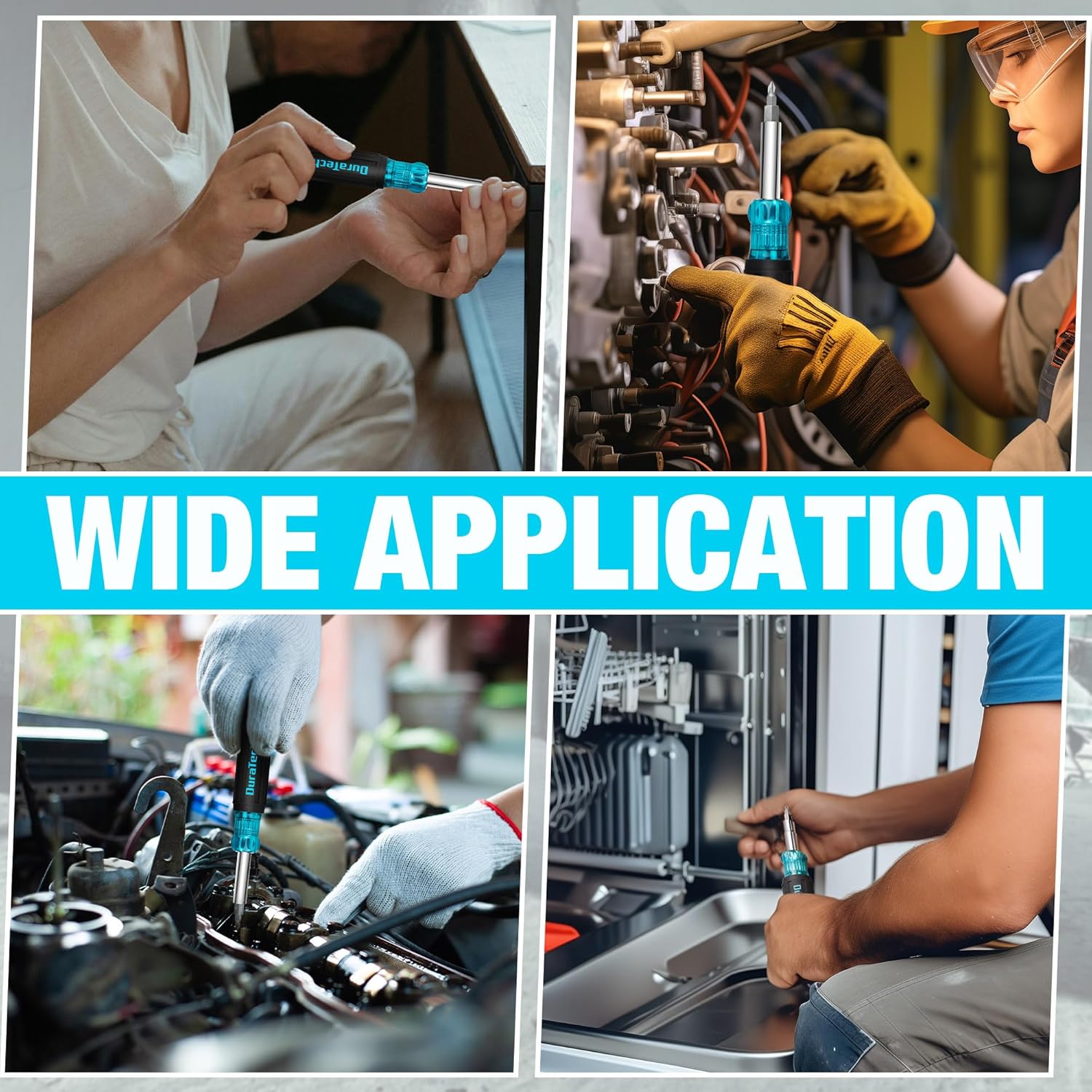 INTERCHANGEABLE AND PORTABLE: Features four double-ended bits conveniently stored in the handle for quick and easy changes. This design saves space and enhances portability, ideal for home, auto repair, outdoor tasks, and more.