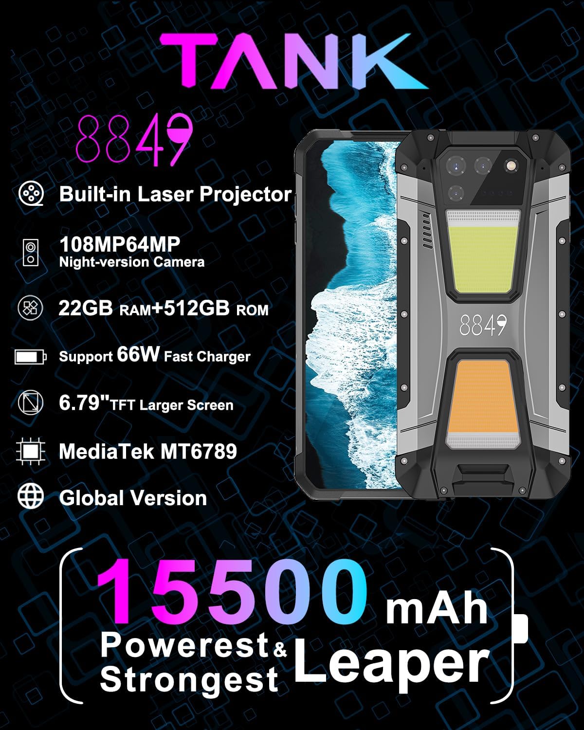 8849 Tank 2, 4G Unlocked Rugged Smartphone with Laser Projector, IP68 Waterproof Outdoor Smartphone with 22GB+512GB, FHD 6.79" ,15500mAh Battery, 108MP Camera, Andriod 13, 66W Fast Charger, OTG/NFC