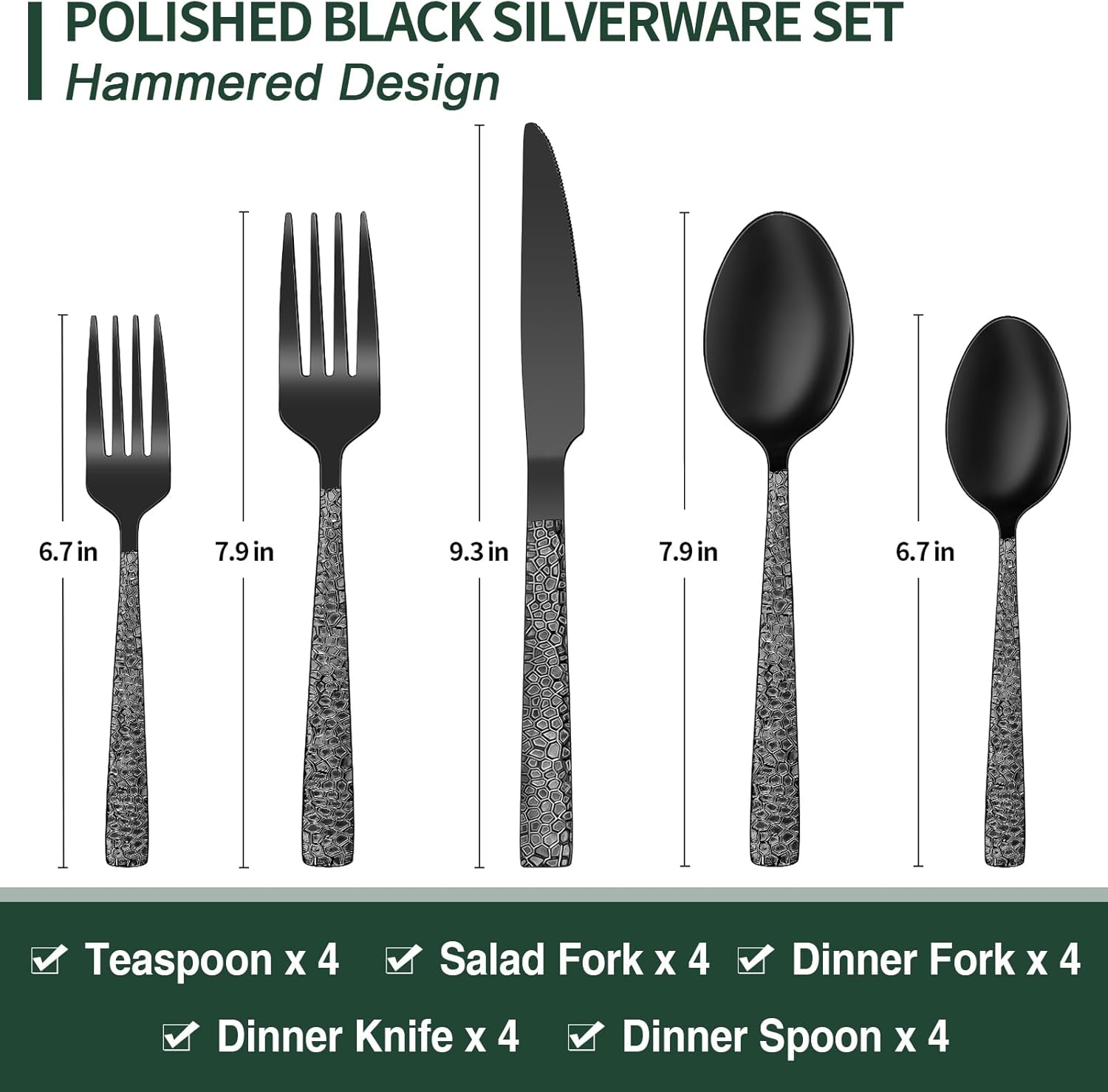 Black Hammered Silverware Set, 20-Piece Stainless Steel Square Flatware Set for 4, Food-Grade Tableware Cutlery/Utensil Sets for Home Restaurant, Mirror Finish, Dishwasher Safe