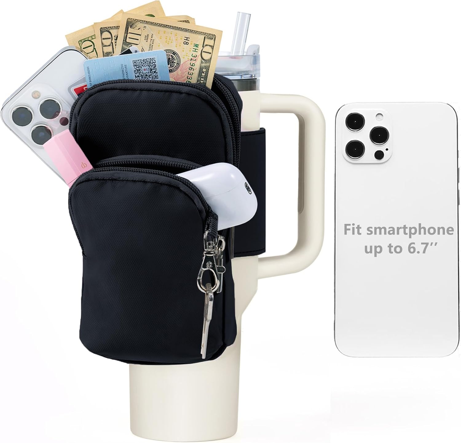 50% Larger Capacity: Our cup bag for Stanley 40 oz is designed to be 50% larger, allowing more storage space for airpods, cash, debit card, lipstick, keys, etc. The main pocket can hold smartphone up to 6.7'', for iPhone 14 Pro Max / Galaxy S23+ / OnePlus 11 5G / Google Pixel 7