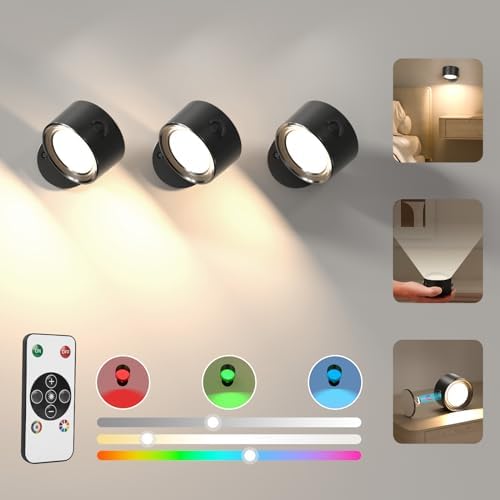 3Pcs LED Wall Mounted Lights, RGB Ambience Wall Sconces Lamp with 3000mAh Rechargeable Battery, 3 Color Temperatures & Dimmable Magnetic 360° Rotation with Remote, Wall Light for Reading Bedside