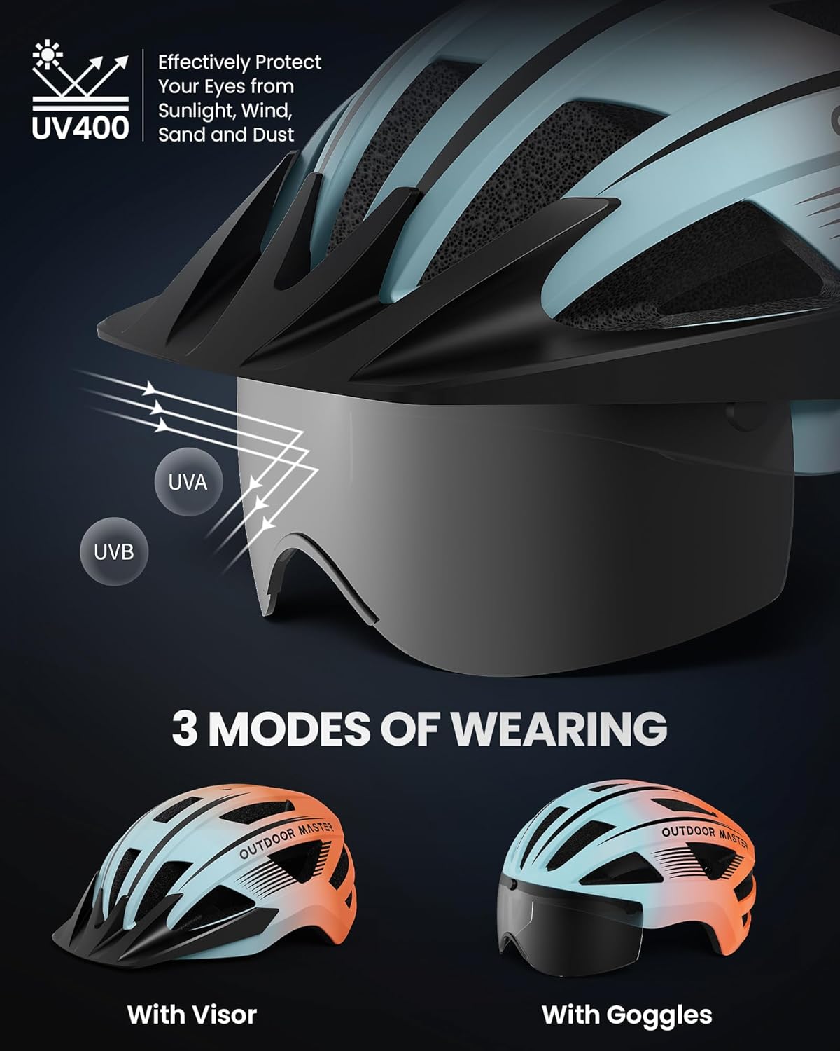 Detachable Goggles and Visor: Road bike helmet comes with magnetic detachable goggles and removable sun visor. Magnetic goggles can protect your eyes from UV rays as well as rain, wind and sand. Sun visor can block the sunlight for a better riding experience. You have the flexibility to match the accessories to your riding needs
