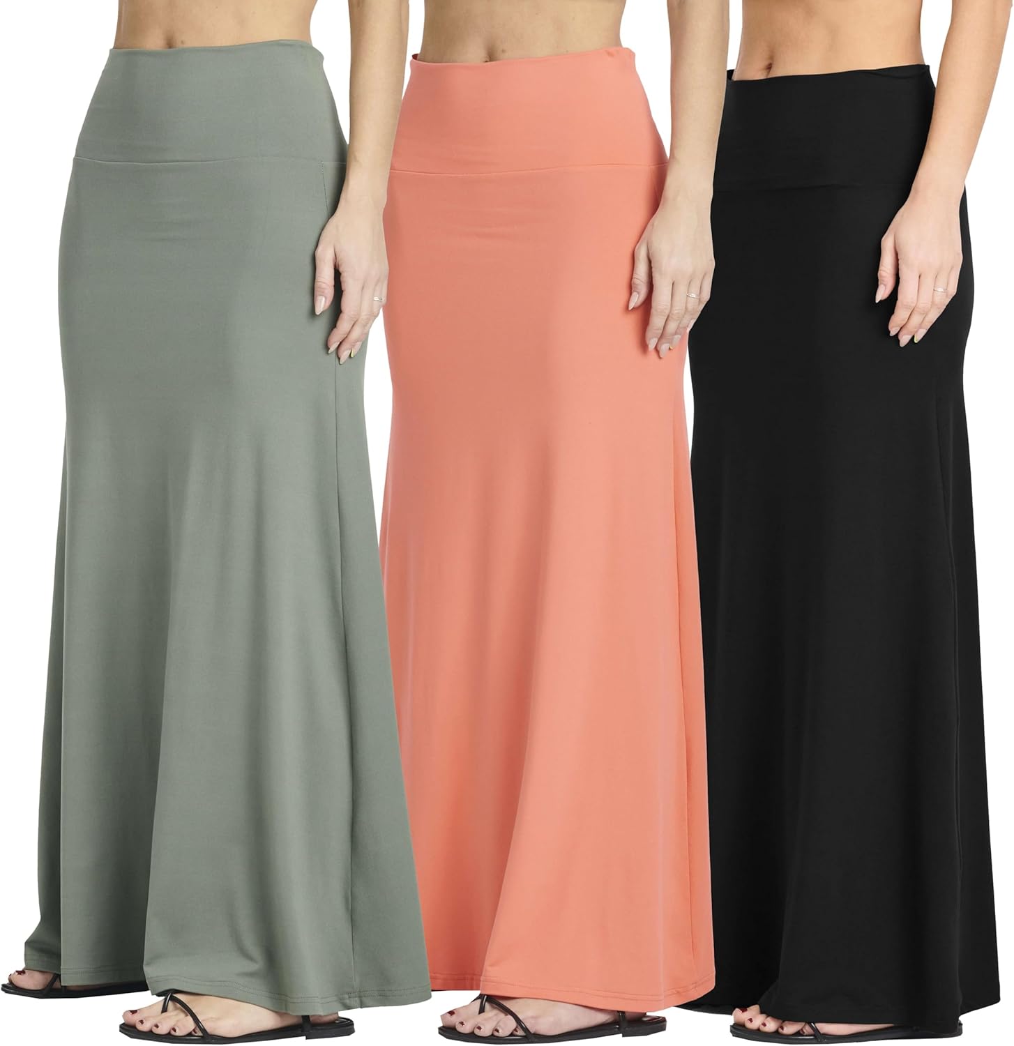 Real Essentials 3 Pack: Women's Ultra-Soft Flowy Maxi High Waisted Long Skirts (Available in Plus Size)