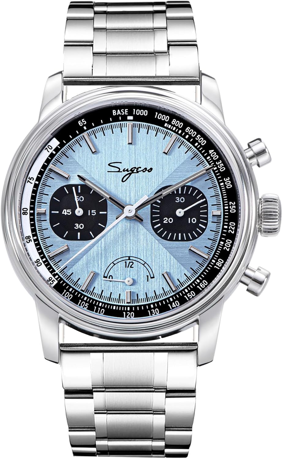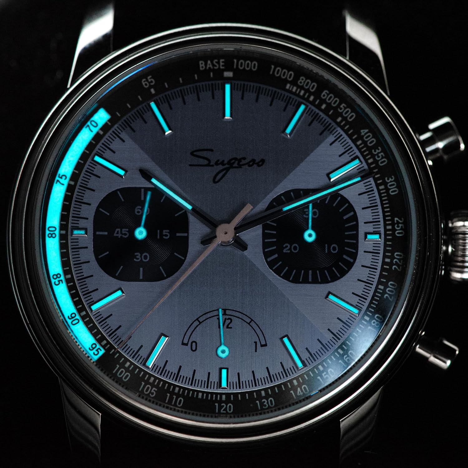 Brand: Sugess Condition: New with tags Series: Chrono Heritage Reference: S438.03.S Function: 12 Hours and seconds Indicator, 30 Minutes Chronograph Features: Column Wheel Chronograph, Blue steel screws and Exhibition Case Back Cover Diameter: 41mm Thickness: 13mm Glass Material: Sapphire Crystal Case Material: 316L Stainless Steel Band: 316L Stainless steel Band Movement: Manual winding Caliber: Genuine Seagull ST1906 Jewels: 21 Vibration: 3 Hz (21,600 BPH) Power Reserve: 45 Hours Water Resistant: 5ATM (50 Meters) English Instruction Manual: Yes