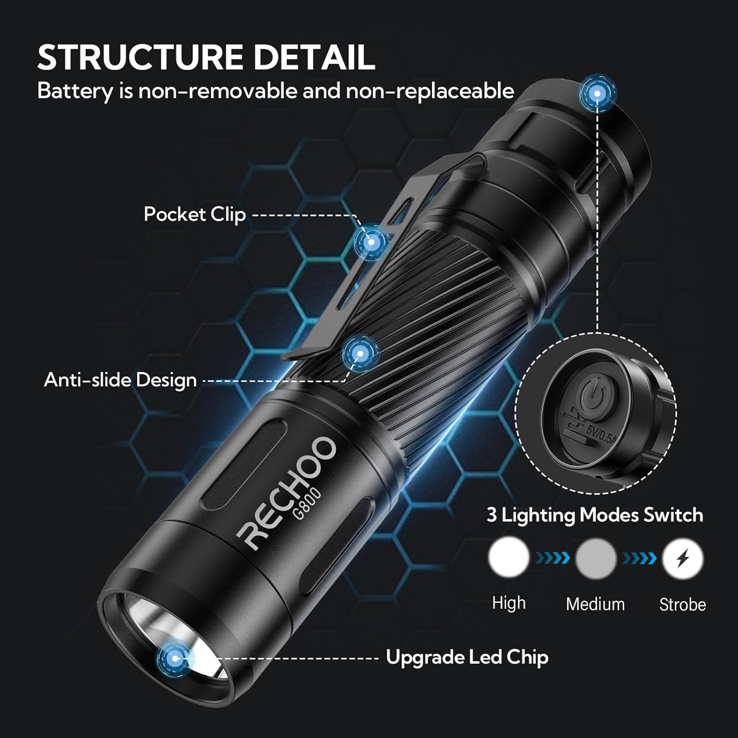 Bright Small Rechargeable Flashlights: RECHOO G800 rechargeable flashlights high lumens feature an upgraded LED chip providing 1000 lumens and 3 lighting modes (high, medium, strobe), perfect for daily use or emergencies; Convenient mode switching and all-in-one design eliminate frequent battery replacements;Compact for everyday carry;