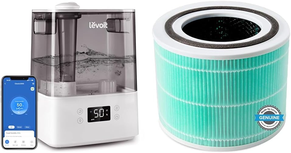 LEVOIT Humidifiers for Bedroom Large Room Home, (6L) Cool Mist Top Fill Essential Oil Diffuser for Baby & Plants, Smart App & Voice Control, Rapid Humidification & Auto Mode - Quiet Sleep Mode, GrayMORE POWERFUL AND SMART GIFTS FOR YOU! Note: Distilled/ purified water is preferred for your health. Specifications: Product Dimensions: 9.6 × 7.5 × 13.4 in / 24.5 × 19.2 × 34 cm Product Weight: 4.3 lb / 2 kg Whisper-Quiet Operation: ≤ 30dB Effective Range: 215–505 ft² / 20–47 m² Material: BPA-free, suitable for babies and adults Features: √ Extra Large Water Tank of 6L √ The operation Lasts Up to 60 Hours, with 7 Nights of Sleep √ Essential Oil Tray √ Free VeSync App and Smart Controls √ Ultra-Quiet Operation √ Night Light √ Zero Light Pollution: The display light can be turned off completely √ 360 Rotating Nozzle √ Automatic Shut-Off Function √ ETL Certified For Safety and Reliability √ It comes with Cleaning Brush TROUBLESHOOTING: The display shows the No Water Indicator incorrectly: 1. Please ensure the arrow above the LED display is aligned with the indicator line on the base to ensure the water tank is properly on the base. 2. Check the max water line to see if there is too much water in the tank and base chamber. Pour out extra water if water is over the max line. 3. Check and clean the Water Outlet Valve. 4. Check whether the Float Brackets rotate smoothly and clean them. WATER FILTER REPLACEMENT: Please search B09ZY9N6PD or Levoit humidifier replacement filter which can extend the life of your humidifier aroma pads REPLACEMENT: Please search B0B8MD45FB or Levoit aroma pads for more information which can help emit a more potent fragrance and protect the fragrance box.LEVOIT Core 300 Air Purifier Toxin Absorber Replacement Filter, 3-in-1 Filter, Efficiency Activated Carbon, Core300-RF-TX, 1 Pack, GreenCore 300 Air Purifier Toxin Absorber Replacement Filter.
