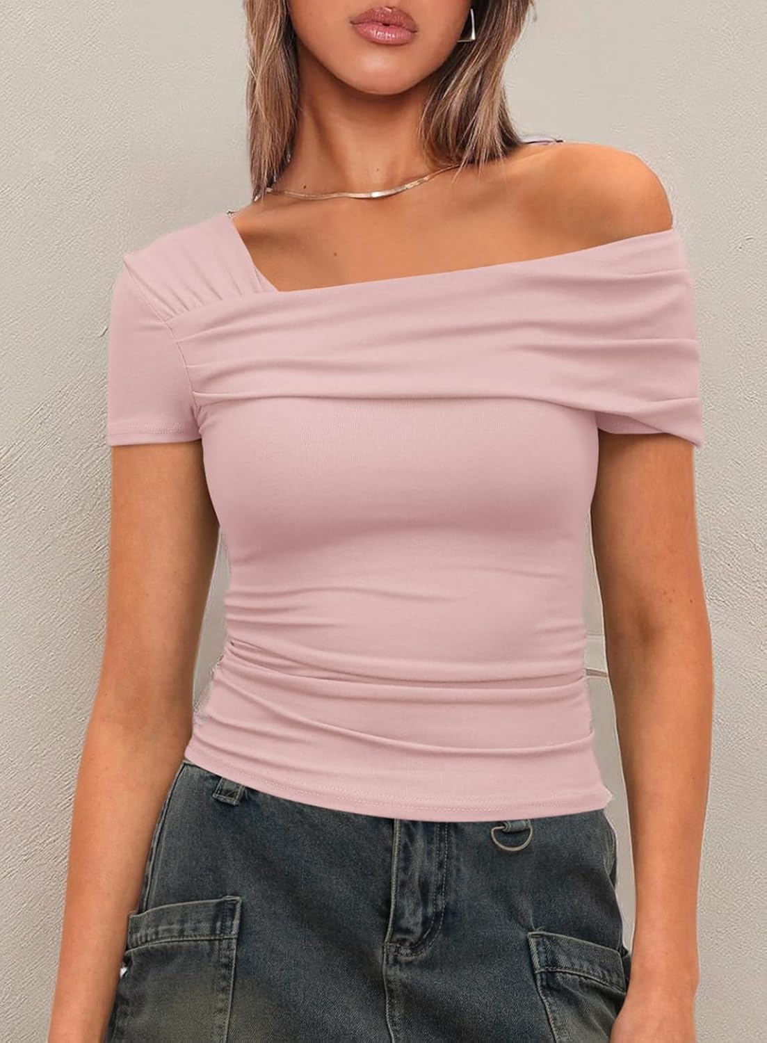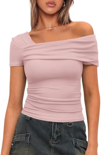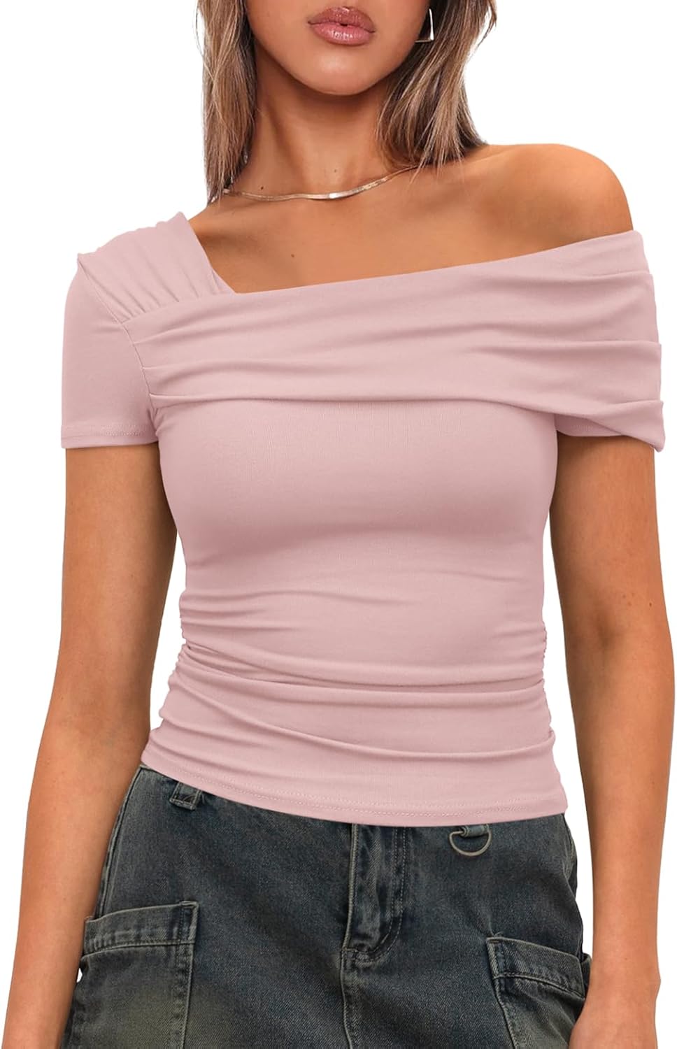 Darong Women's Summer Short Sleeve One Off The Shoulder Top Ruched Going Out Tops Slim Fit Y2K Shirt