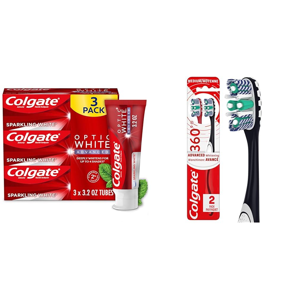 Colgate Optic White Advanced Teeth Whitening Toothpaste & 360 Optic White Advanced Toothbrush, Medium Toothbrush for Adults,2 Count (Pack of 1)
