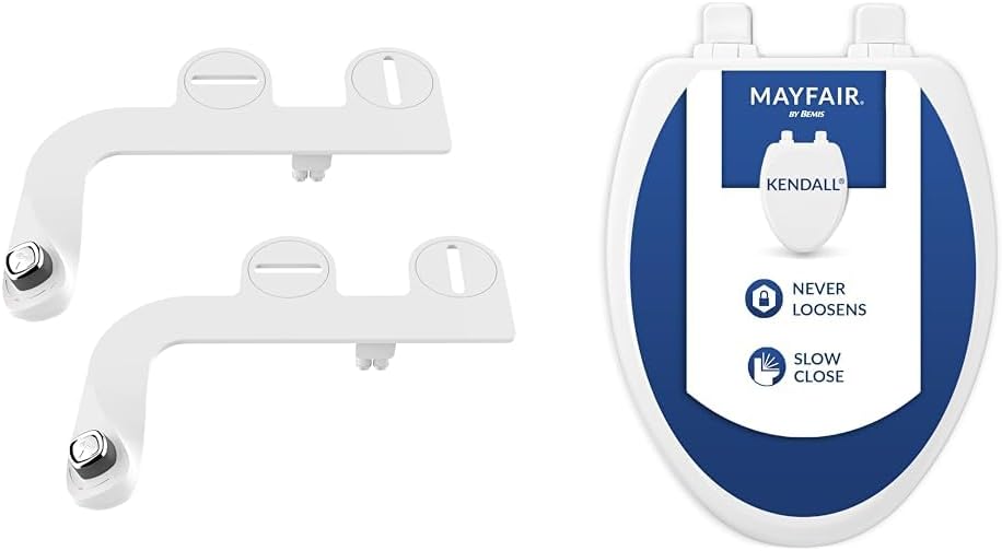 Bio Bidet by Bemis SlimEdge 2-Pack of Freshwater Attachments, White, Non-Electric, Easy Install Bidet Toilet Seat, 2 CountTreat yourself to a bathroom upgrade with the Bio Bidet by Bemis SlimTwist bidet attachment for your toilet. Using the comfort twist control knob, you have complete control over the responsive, adjustable water pressure. Personalize your wash for women and for men with this easy-to-use attachable bidet. Soothing postpartum care, hemorrhoid treatment, front and back cleansing are all possible with built-in retractable dual nozzles. All necessary components for installation are provided including the t adapter valve, water hose and bidet connectors. Bidet installation is easy, no plumber, no electricity, no batteries, and no wiring needed. Easily enhance the functionality of your bathroom on your own with a fast 15 minute install. Built to last, the Slim Twist bidet attachment features a quality design built-in brass valve and inlet, alongside a braided metal water supply hose. Join the movement! Reduce the need for toilet paper and live a fresh, clean lifestyle by switching to a bidet. From bidet sprayers, to bidet attachments, to bidet toilet seats, to full bidet toilet systems, we have the best bidet option for you. Bio Bidet by Bemis is proud to offer innovative products that are easy to install and built to last.Mayfair 1847SLOW 000 Kendall Slow-Close, Removable Enameled Wood Toilet Seat That Will Never Loosen, 1 Pack ELONGATED - Premium Hinge, WhiteThis Mayfair durable enameled wood toilet seat uses Whisper Close technology which allows the seat and lid to close slowly and quietly with no slamming or pinched fingers. The seat can be adjusted front to back up to 1/2 inch for a perfect, flush fit with your toilet bowl and is easy to remove for cleaning and replacement with Easy Clean hinges. With the innovative STA-TITE Seat FasteningSystem, the seat does not shift around and stays firmly attached to the toilet bowl. This seat is proudly made in Sheboygan Falls, Wisconsin, USA and fits most manufacturers' ELONGATED bowls in the US and Canada. NOTE: Colors on a website or printed from a website can vary drastically from the actual color of the toilet seat due to monitor and printer settings. The colors on this page are for approximate visual use and should not be used to match colors exactly to a toilet bowlAbout Mayfair by Bemis – For over 60 years, Mayfair has been bringing quality products with innovation and style to homes throughout North America. Mayfair toilet seats provide a wide variety of designs to easily integrate into any bathroom. The needs of customers are at the forefront of design with unmatched features and benefits that make everyday lives easier. Bemis Manufacturing Company, the world’s largest manufacturer of toilet seats. Founded in 1901, and in the fourth generation of family ownership, Bemis has grown from a maker of furniture and wooden wagons to an international enterprise with manufacturing and warehousing facilities worldwide. In addition to manufacturing toilet seats, Bemis is one of North America’s top non-automotive producers of contract plastic injection-molded components. With a continued commitment to the worldwide community, Bemis Manufacturing Company strives to set the standard for ecological responsibility, conservation and preservation.