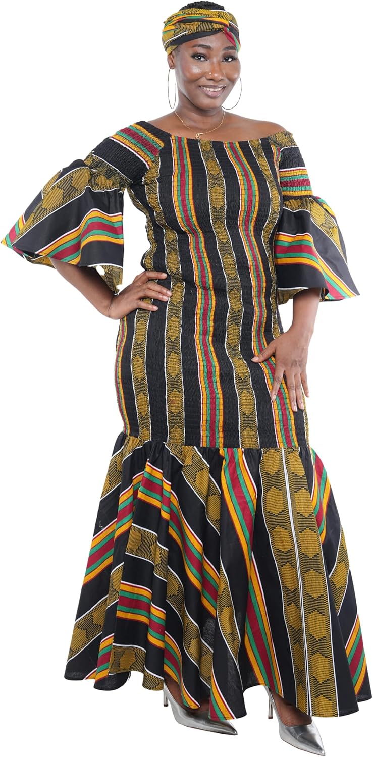Women's Long African Dress Ankara Print | Cotton Clothing Smoked Fish Tail Mermaid with Matching Headwrap, Fade Resistant Elastic Smoked Bodice Kente Afrocentric Dress