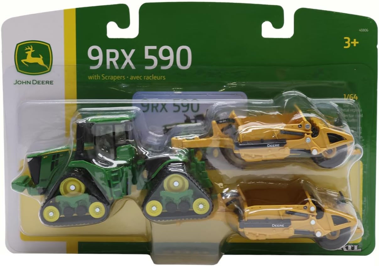 1/64 John Deere 9RX 590 with 1812DC Scraper Toy - LP84498. Replicated in 1:64 scale, this set includes a 9RX 590 Scraper Special tractor and two 1812D c scrapers. The tractor features die cast metal parts, a detailed cab interior with clear plastic windows, and soft PVC tracks that freely roll. Both scrapers are also constructed of die cast metal and feature free rolling wheels. Hitch all three units together to recreate a popular worksite appearance. Age Grade: 3+. Die-cast metal replica with Collector card. Made of some plastic parts. Tractor measures approx.: 5" in length. Scrapper measures approx.: 4.5" in length. This is a Licensed John Deere Product.