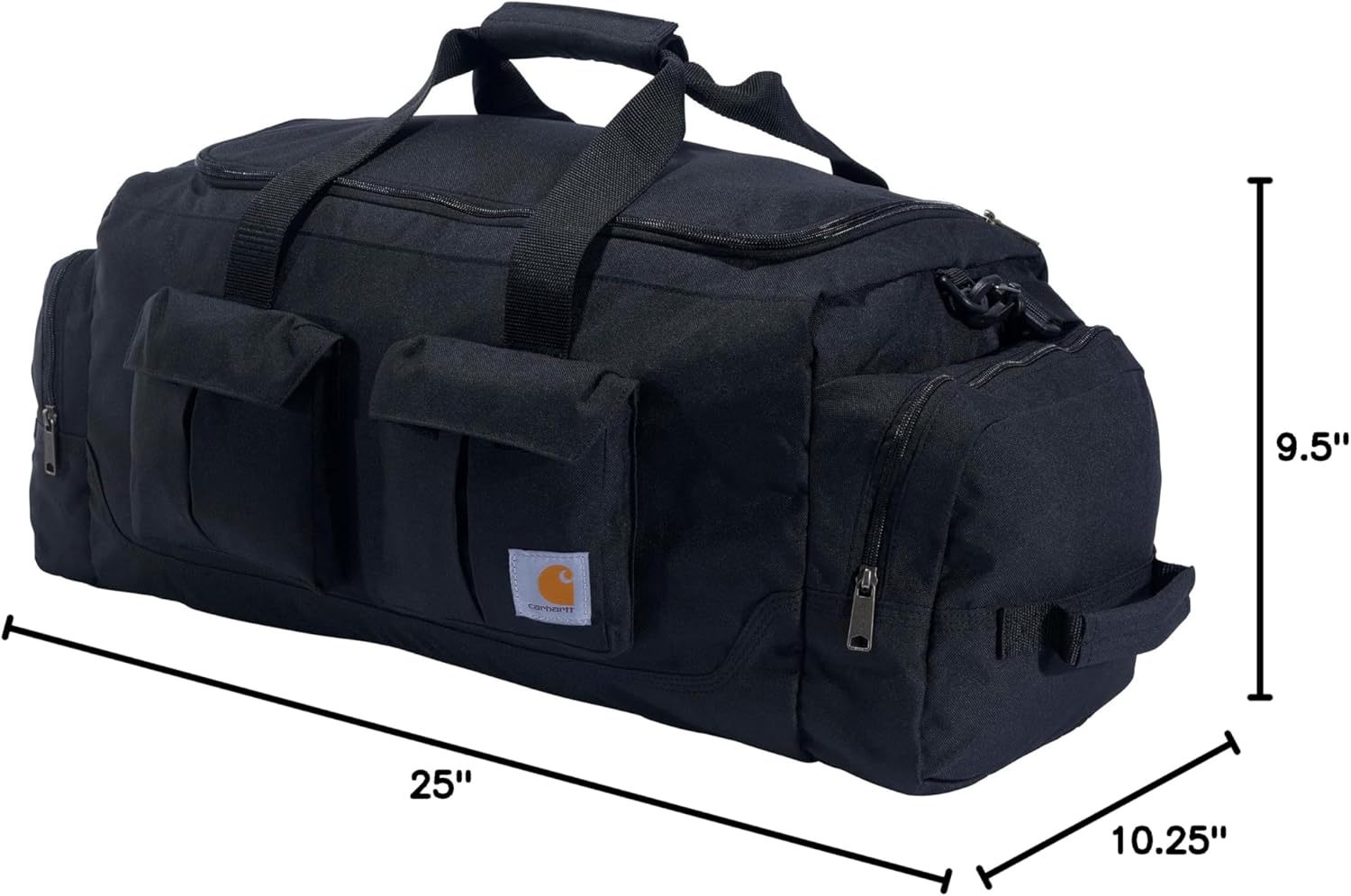 Everday Duffel bag built Carhartt strong crafted to accompany you on the jobsite, the gym, and overnight excursion. 600 denier polyester with Rain Defender durable water repellent, durable fabric keeps all your valuables dry and secure. Bag features U-shaped zippered opening into large main compartment, two front pockets with flap closure, two zippered end compartments, large rear exterior zippered pocket, Ten interior mesh pockets, padded top and side haul handles, removable, adjustable shoulder strap providing comfort and versatility. 25” X 10.25” X 9.5” dimensions.