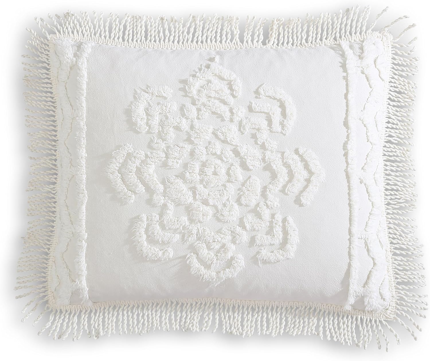 Beatrice Home Fashions Standard Sham, Ivory, Lotus Medallion 100% Cotton Chenille, Soft, Cozy, Lightweight, Fringe