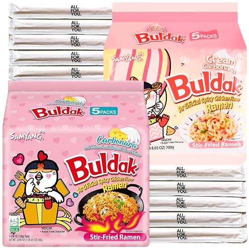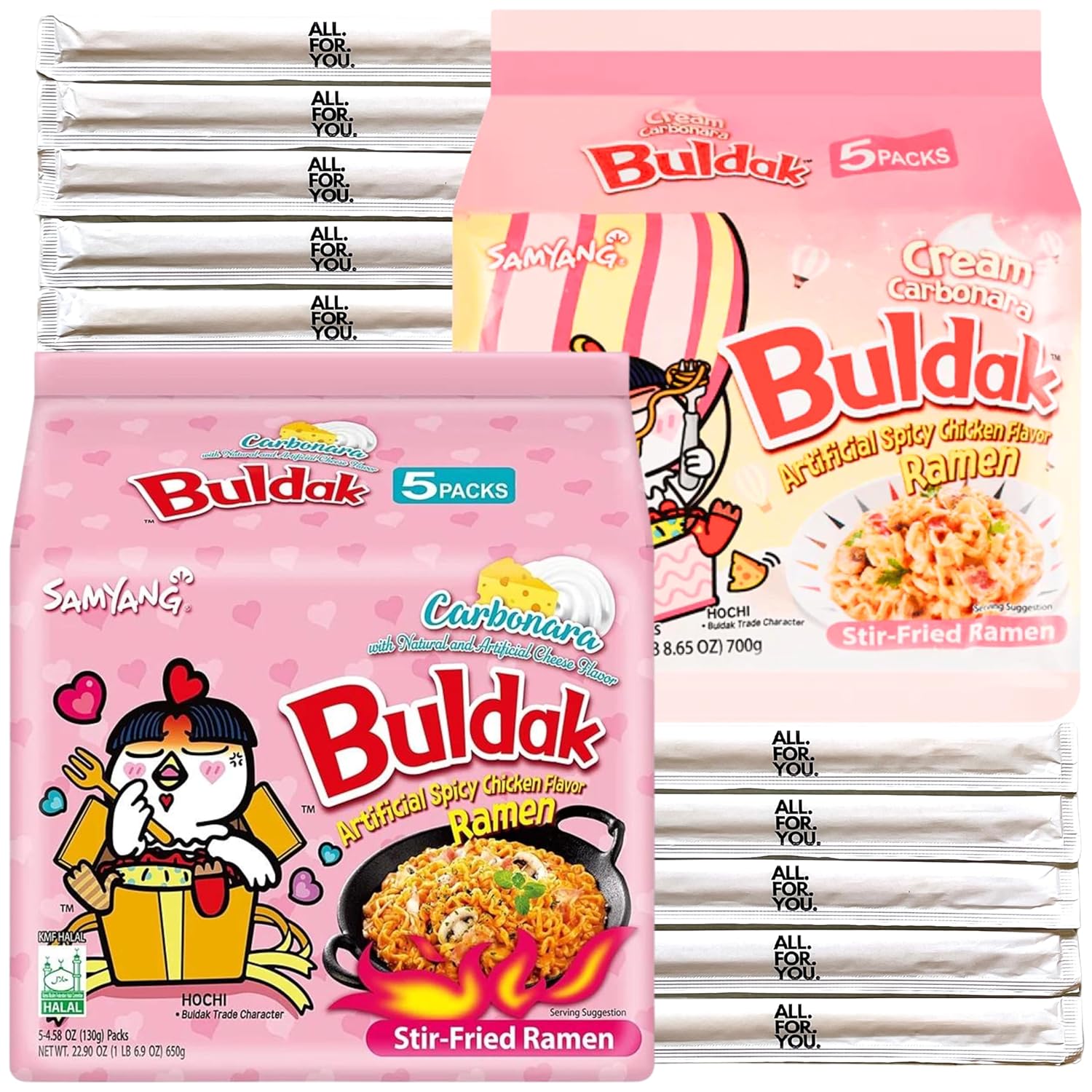 Buldak Ramen Noodles Total 10 pack - 2 Flavor Variety Combo - Carbonara Buldak 5 pack, Cream Carbonara Buldak 5 pack - Spicy Ramen Noodles Buldak Ramen Korean Spicy Hot Chicken Stir-Fried Noodles Bundle with 10 ALL.FOR.YOU. Branded Chopsticks