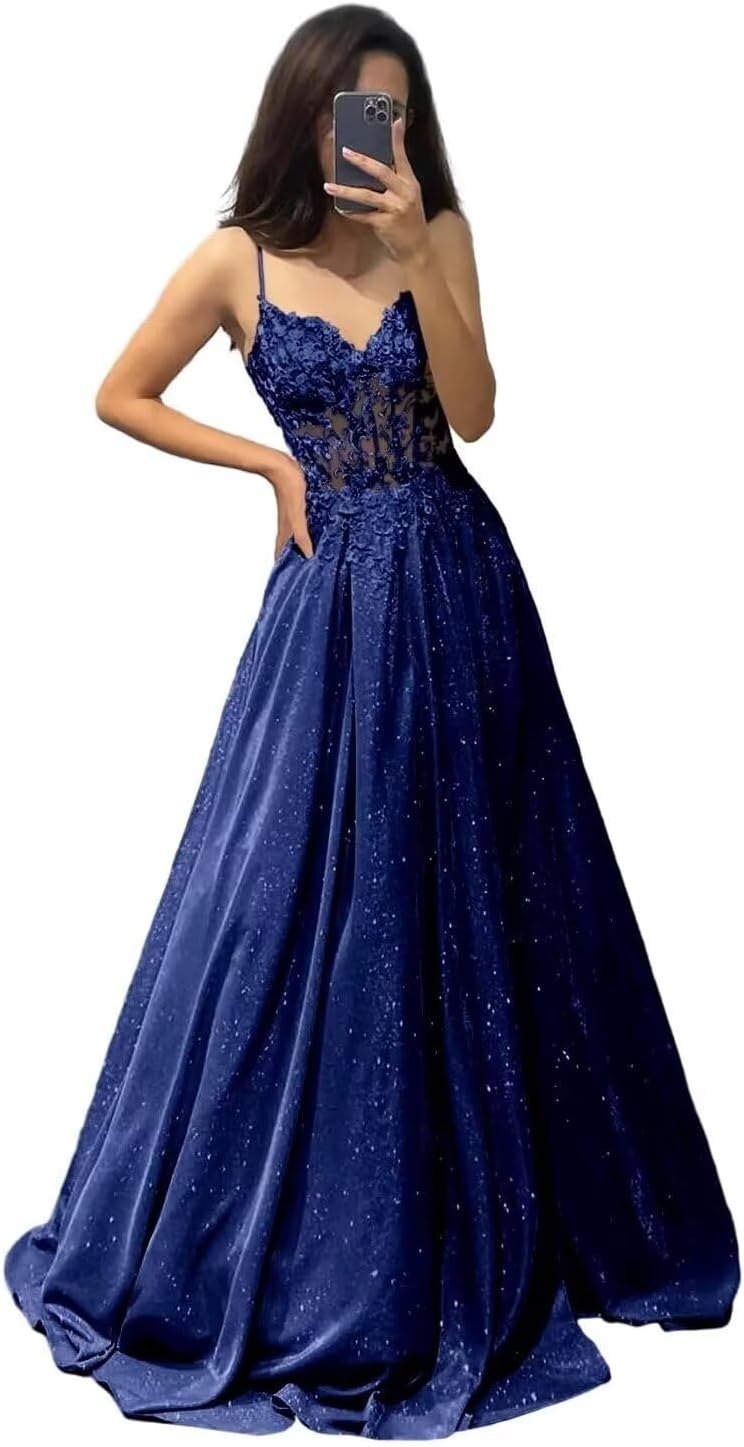 GARDOM Spaghetti Straps Lace Applique Sparkly Prom Dresses 2024 Glitter Satin Formal Evening Party Dress with Pockets
