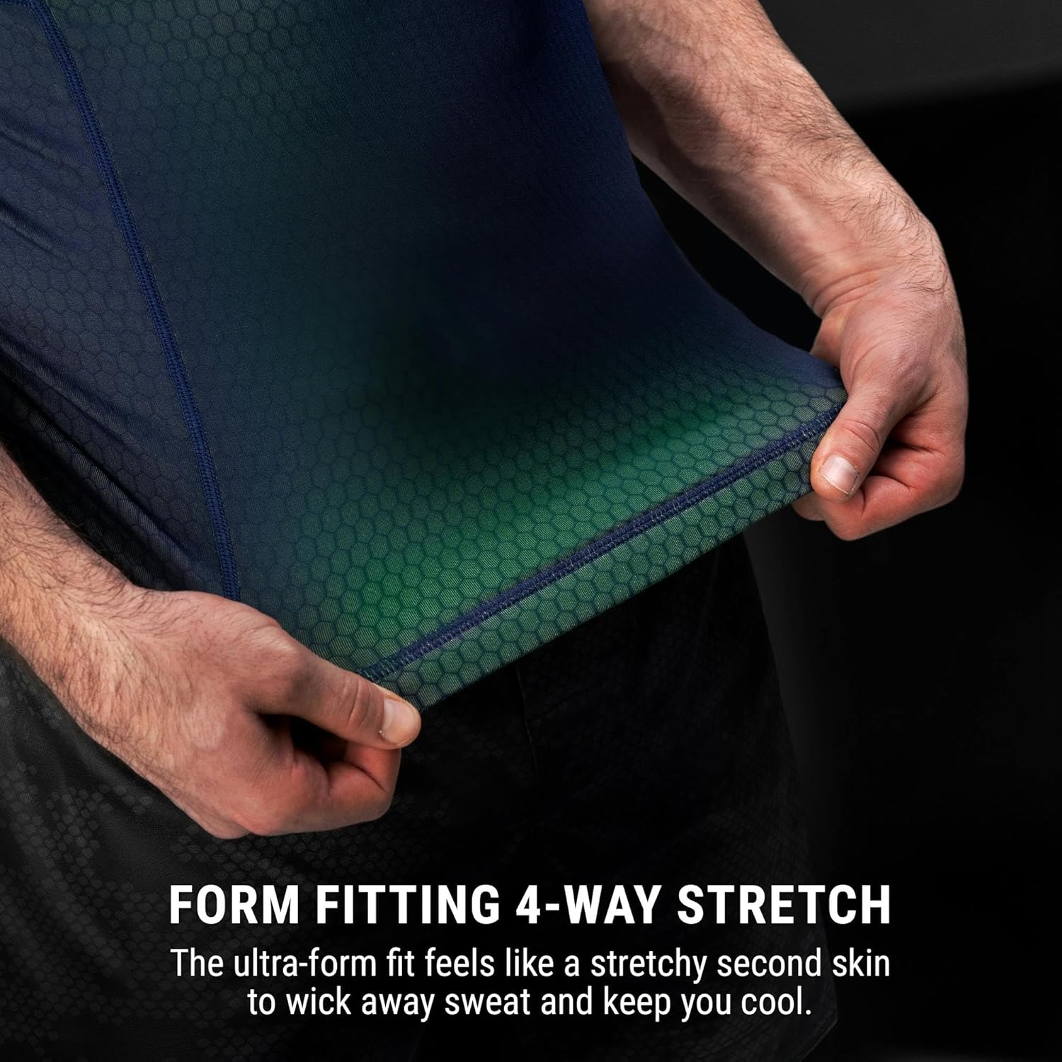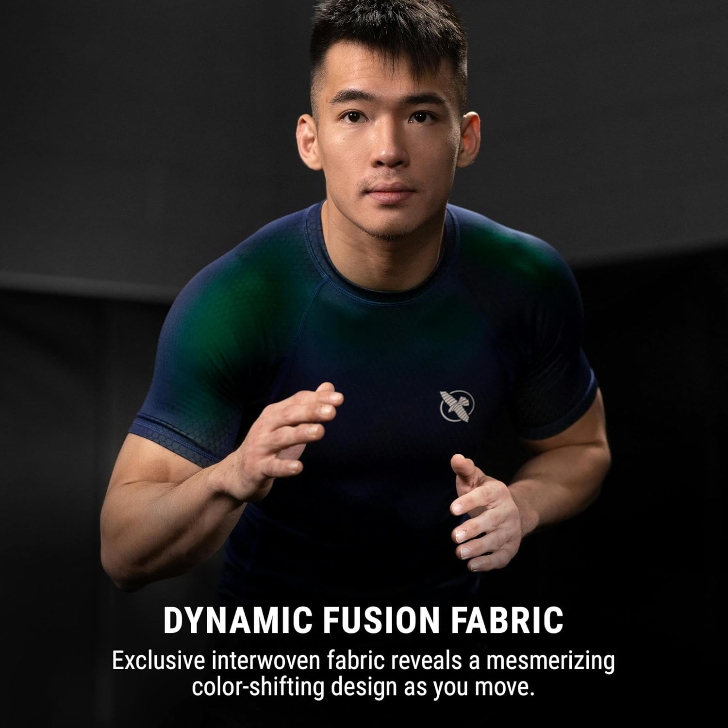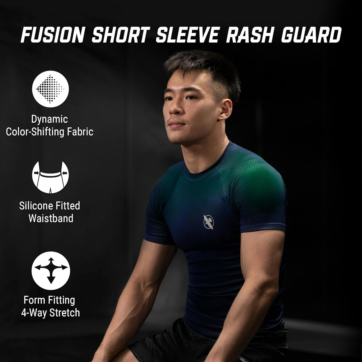 The Fusion Short Sleeve BJJ Rash Guard keeps you at your peak when your training gets heated. The smooth, form-fitting design feels like a second skin, wicking away sweat to keep you cool and adapting to your movement with its color-shifting design. Locked in place with a comfortable silicone waistband, the reinforced fabric provides an essential layer of protection to shield your skin from mat burns and scratches during your jiu-jitsu session. Features Specifications Exclusive interwoven Fusion fabric shifts colors as you move Silicone fitted waistband comfortably locks rash guard in place 4-way stretch fabric provides versatile mobility Sweat-wicking ultra-form fit conforms to your body for elite performance Reinforced flatlock stitching provides unmatched durability Athlete 1 with beard: 5’7, 150lbs wearing a smallAthlete 2 in Grey/Aqua & Black/Purple: 5’9, 155lbs wearing a smallAthlete 3 in Blue/Green: 5’9, 158lbs wearing a small Materials: Soft 94% polyester 6% elastane blendWaistband: Anti-slip silicone waistbandConstruction: 8 Panels, 4-way stretchStitching: Reinforced flatlock stitchingBest for: Jiu-Jitsu, Striking, Cross TrainingCare Instructions: Machine wash cold, hang to dry NOTE: The Fusion Rash Guard features an ultra-form fit. If you prefer your rash guards looser, you should size up.