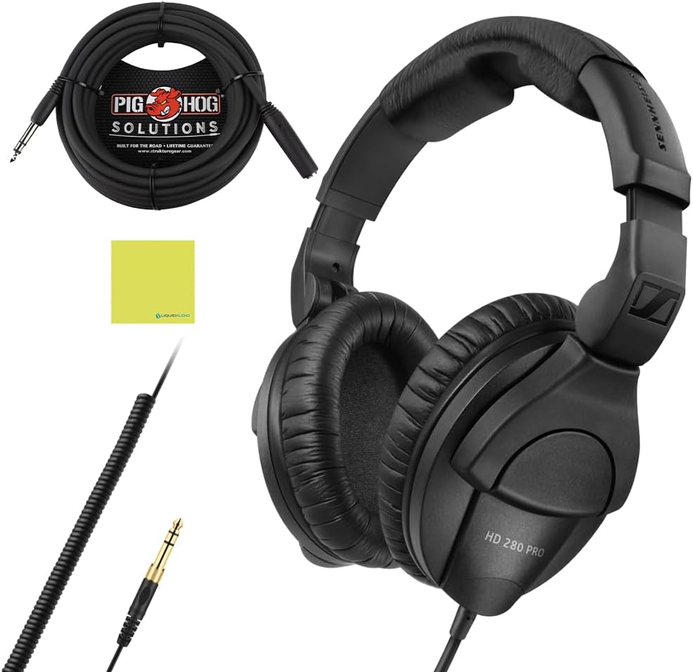 INCLUDES: Sennheiser HD 280 PRO Over-Ear Monitoring Headphones, Black Bundle w/ Pig Hog PHX14-25 1/4" Headphone Extension Cable, 1/4" Adapter & Liquid Audio Polishing Cloth.